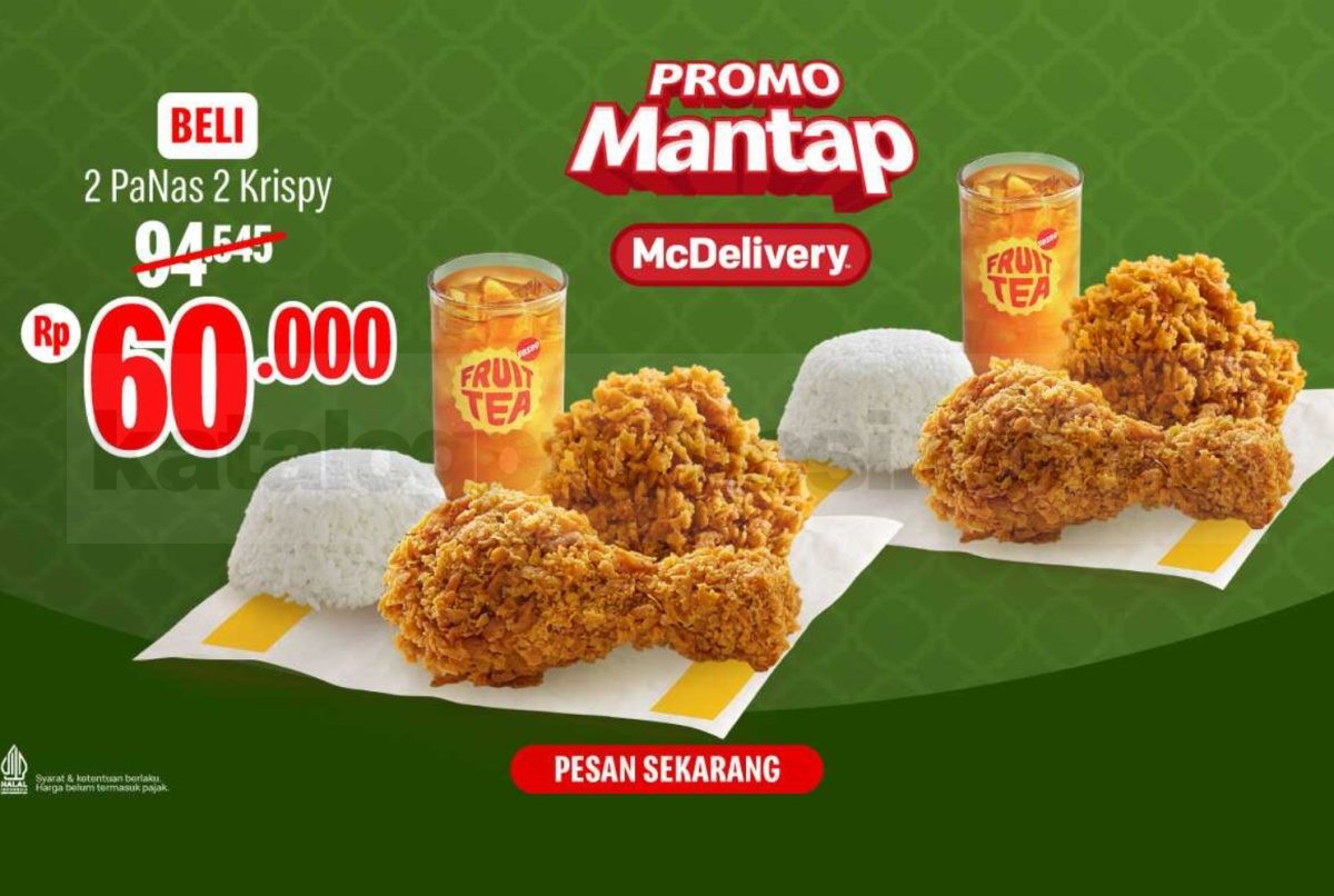 Promo McDonalds Mantap Senin 2 PaNas 2 Krispy Rp. 60.000 khusus pemesanan McDelivery setiap hari Senin, harga sebelum pajak dan tidak digabung penawaran lain.