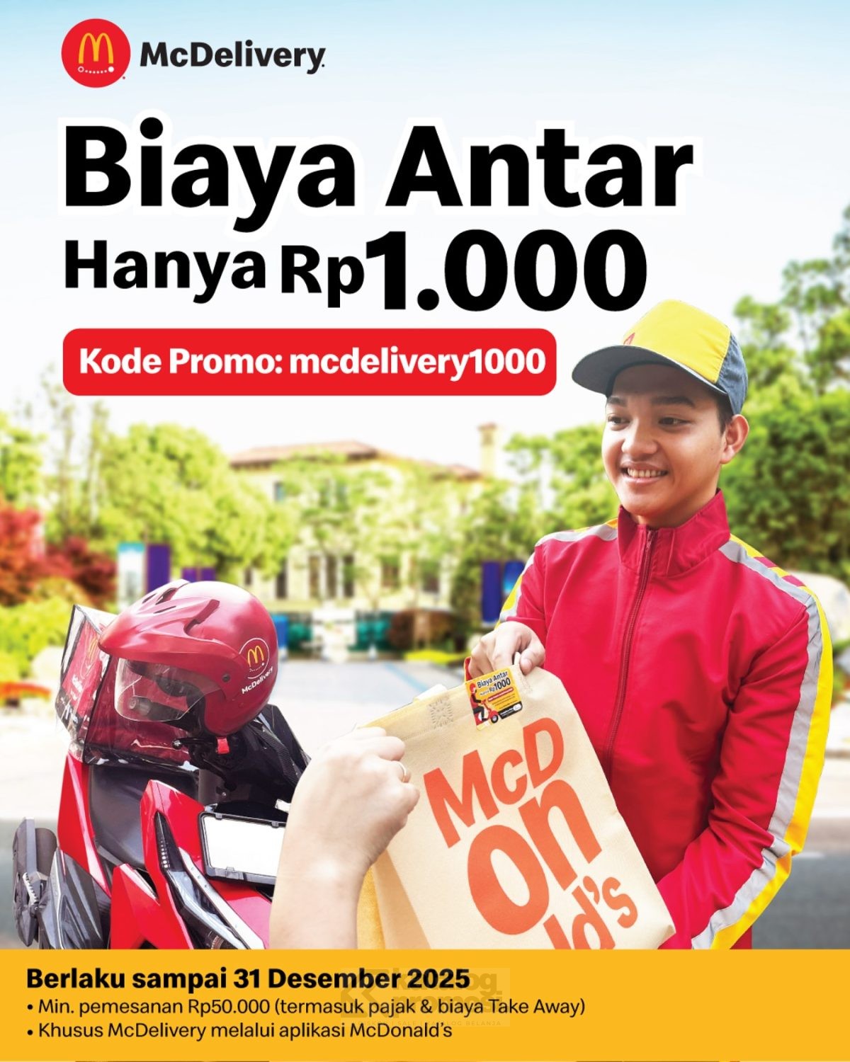 Promo McDonald’s McDelivery! Pesan menu favorit lewat McDelivery dengan biaya antar hanya Rp1.000! Gunakan kode promo mcdelivery1000 untuk pesanan minimal Rp50.000. Berlaku hingga 31 Desember 2025.