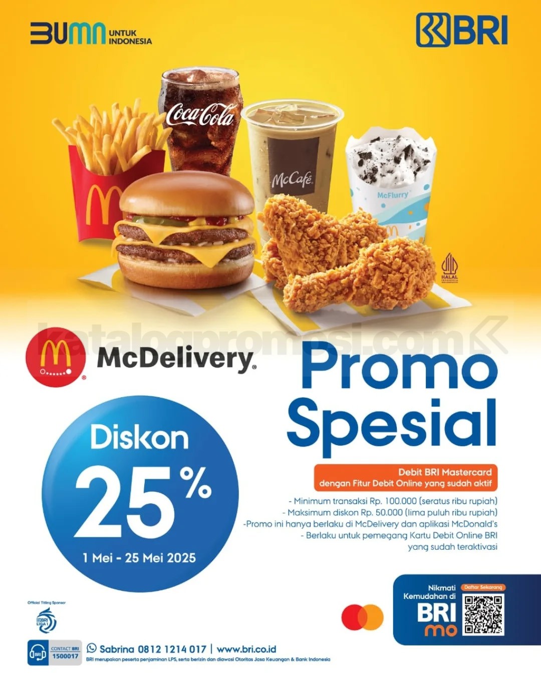 Promo McDonald’s McDelivery โ Diskon 25% hingga Rp50.000 untuk pemesanan min. Rp100.000 pakai Kartu Debit BRI Mastercard selama 1โ25 Mei 2025.