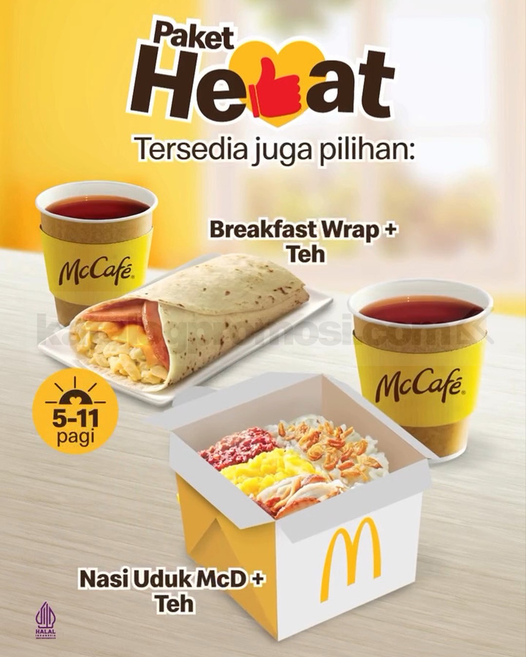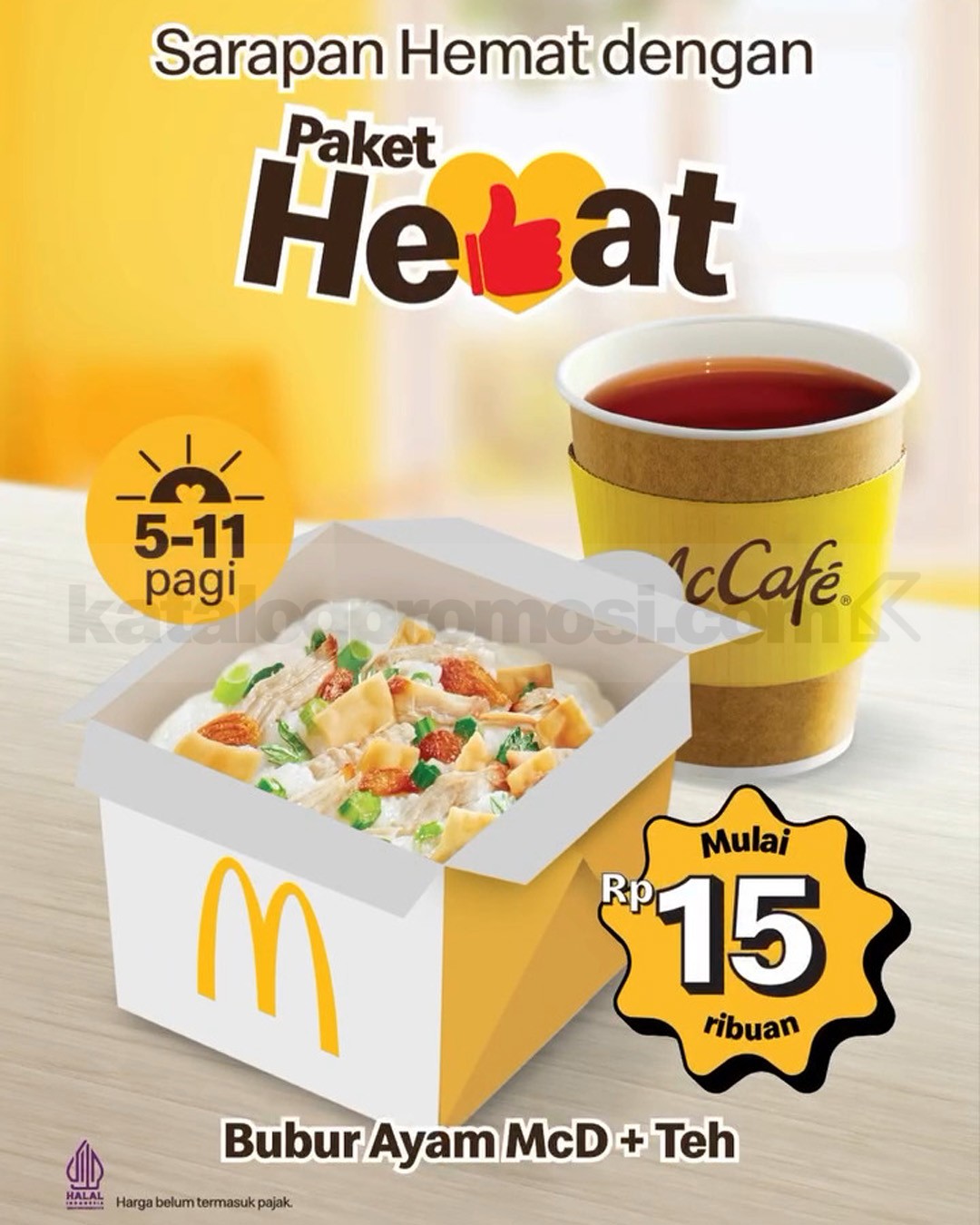 Promo McDonald’s Paket Hemat Sarapan mulai Rp15.000 berisi Bubur Ayam, Breakfast Wrap, atau Nasi Uduk plus teh hangat, berlaku tiap hari jam 5 – 11 pagi.