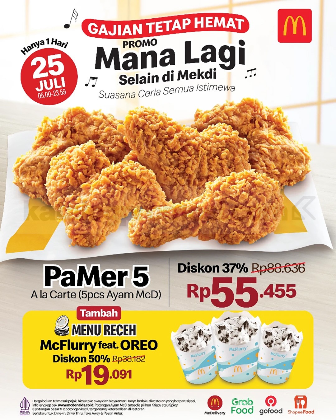Promo McDonald’s Payday! PaMer 5 cuma Rp55 ribuan dan McFlurry isi 3 Rp19 ribuan, bisa dinikmati dine-in, drive thru, atau delivery langsung, berlaku 25 Juli 2025