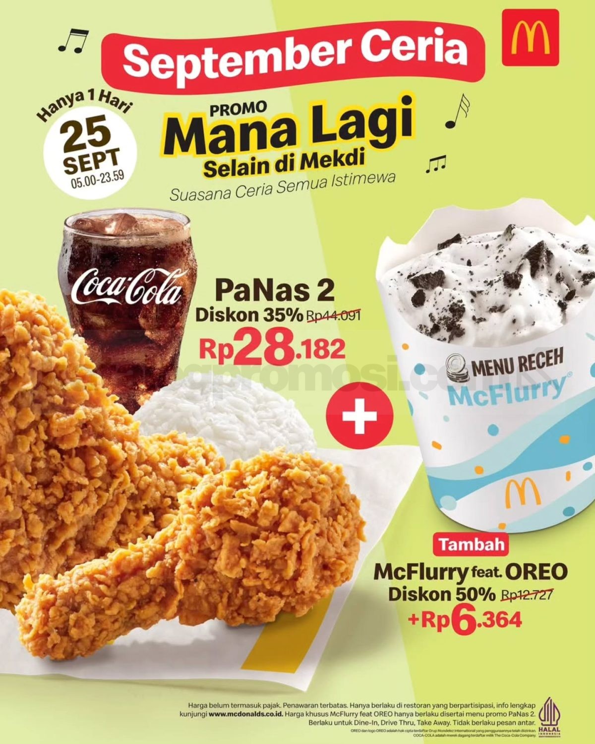 Promo McDonalds September Ceria 25 September 2025, PaNas 2 cuma Rp28 ribuan dan McFlurry OREO Rp6 ribuan. Berlaku 1 hari di outlet McD tertentu.