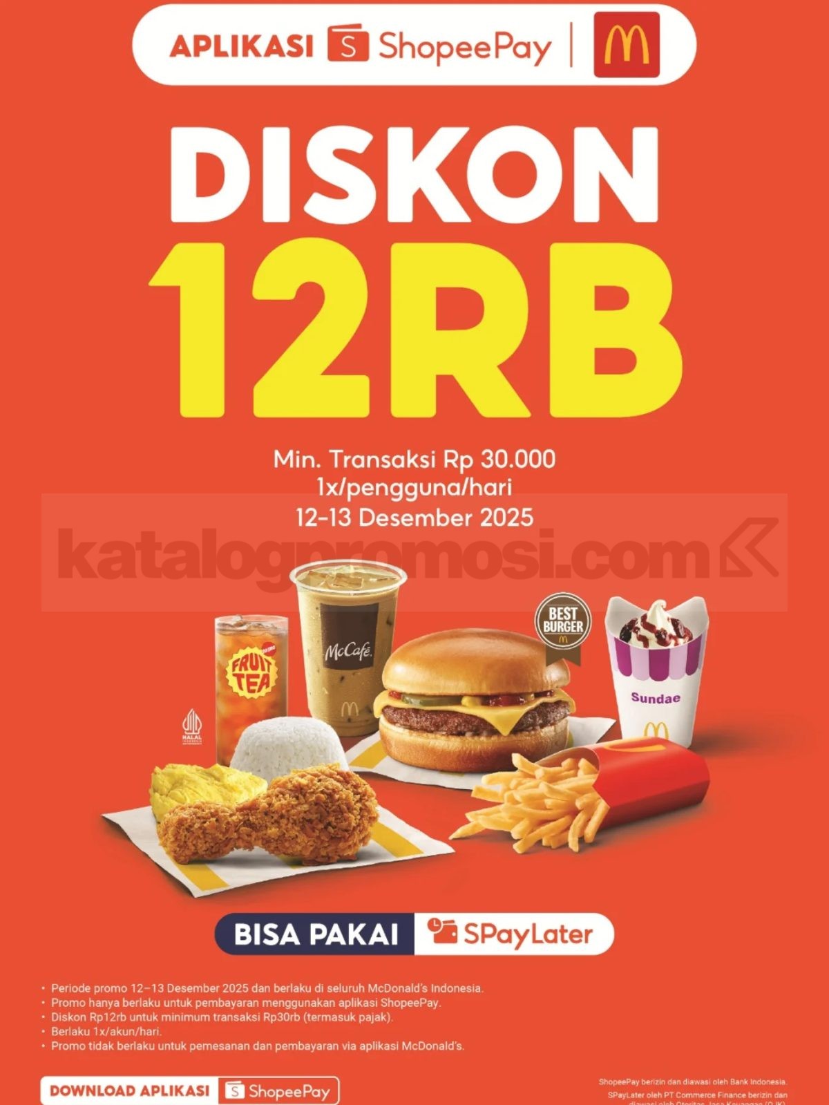Promo McDonalds ShopeePay 12.12 Diskon Rp. 12.000 berlaku 12–13 Desember 2025 untuk transaksi minimal Rp. 30.000 dengan pembayaran via aplikasi ShopeePay di seluruh restoran.