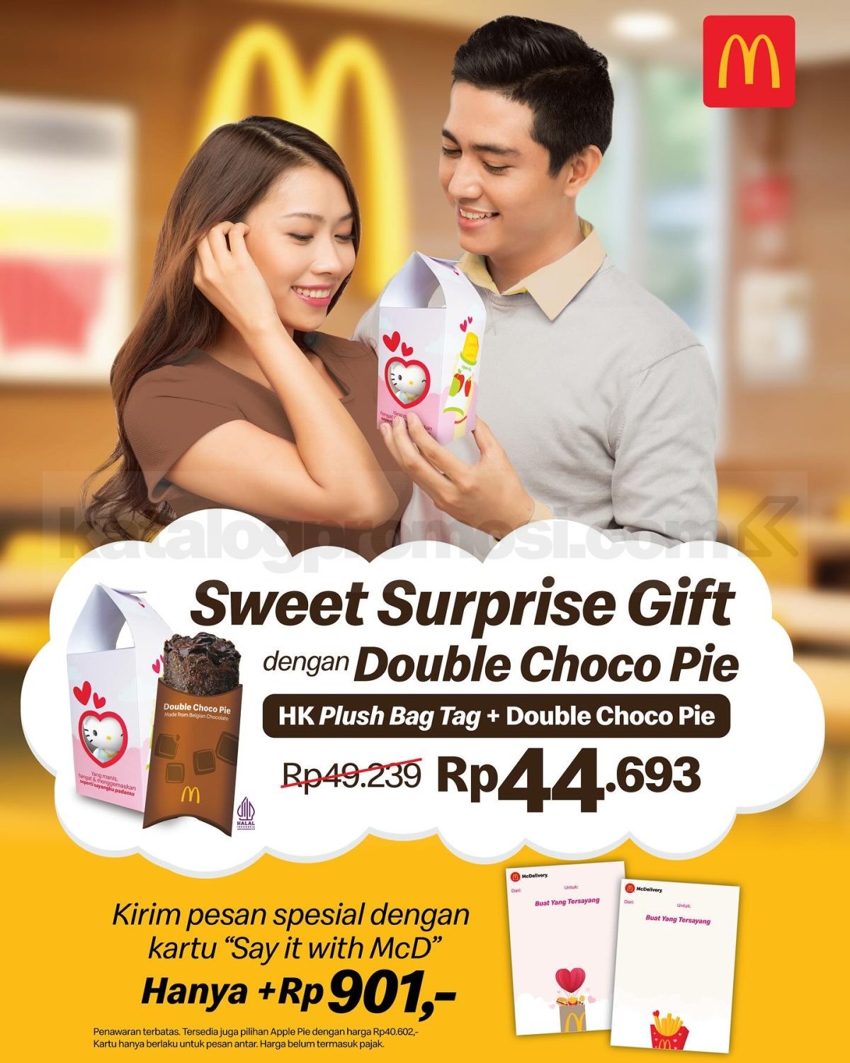 Beli paket Sweet Surprise Gift berisi plush bag tag + pilihan pie (Double Choco Pie atau Apple Pie) dengan harga hemat. Tambahan kartu ucapan “Say it with McD” hanya Rp901 untuk pesanan delivery.