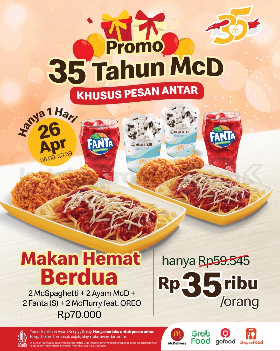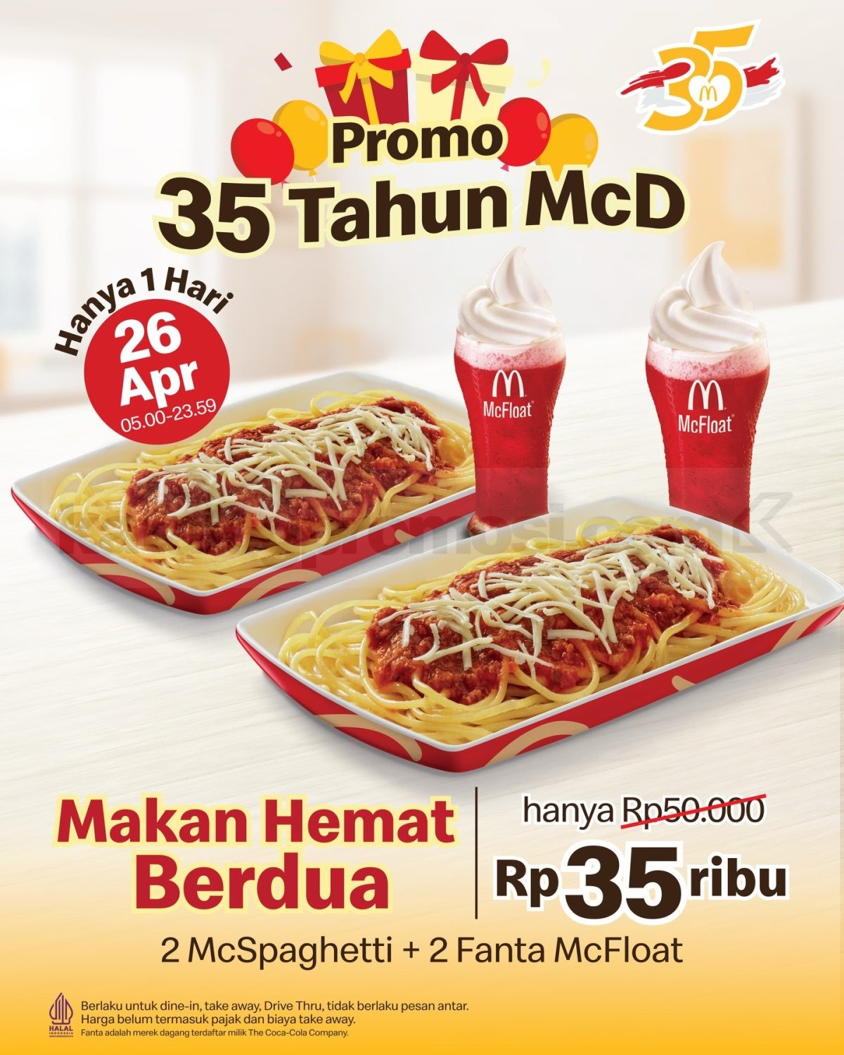 Promo McDonald’s Ultah ke-35 Paket Berdua Rp. 35.000 nikmati McSpaghetti dan Fanta McFloat berlaku mulai tanggal 26 April 2026 di seluruh outlet.
