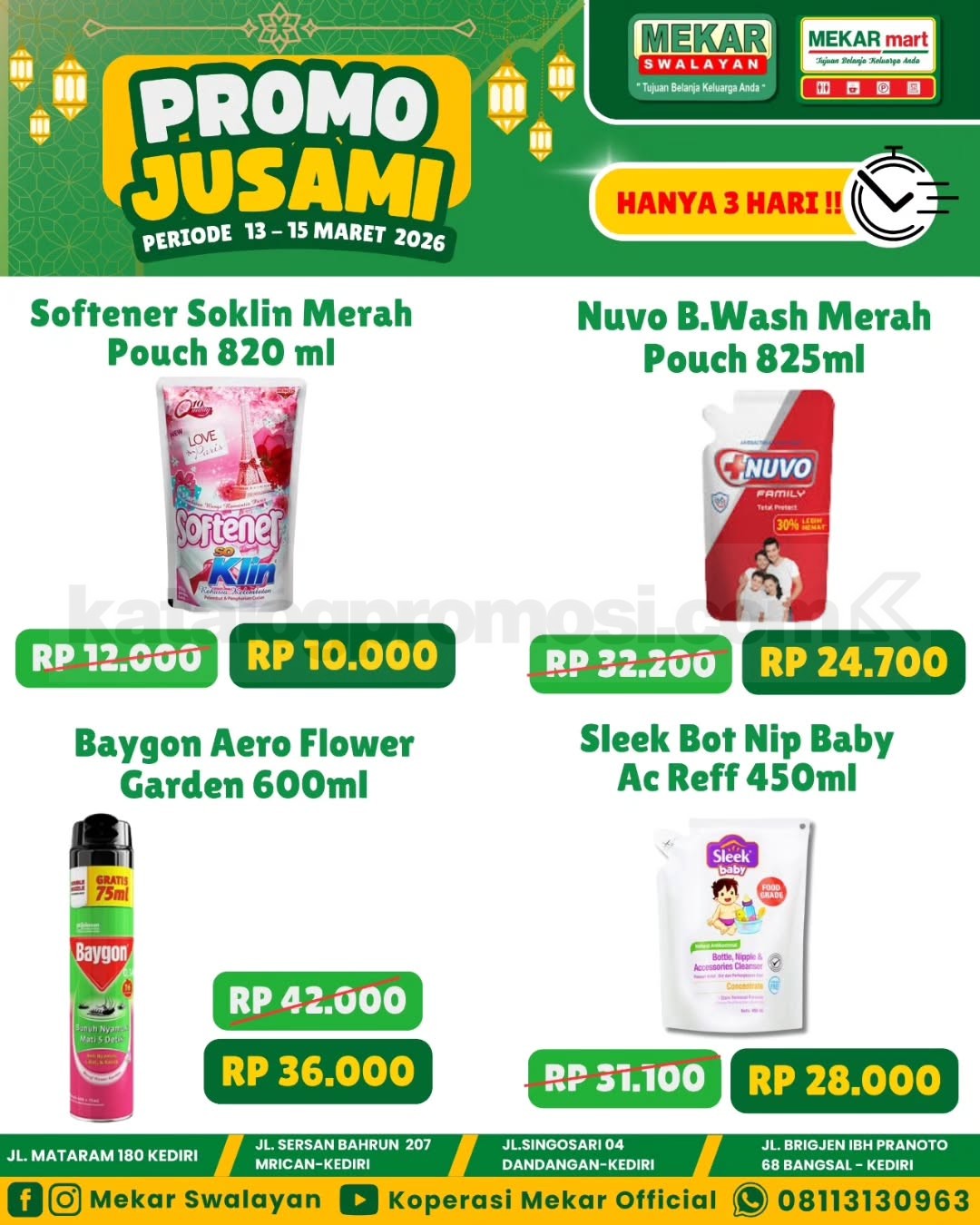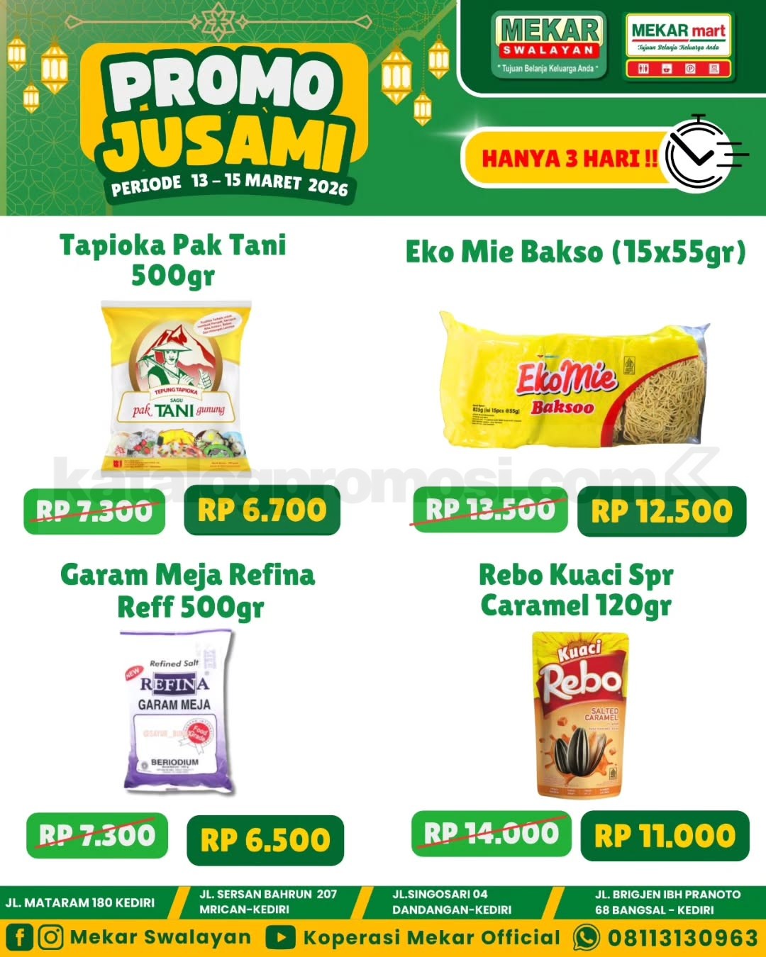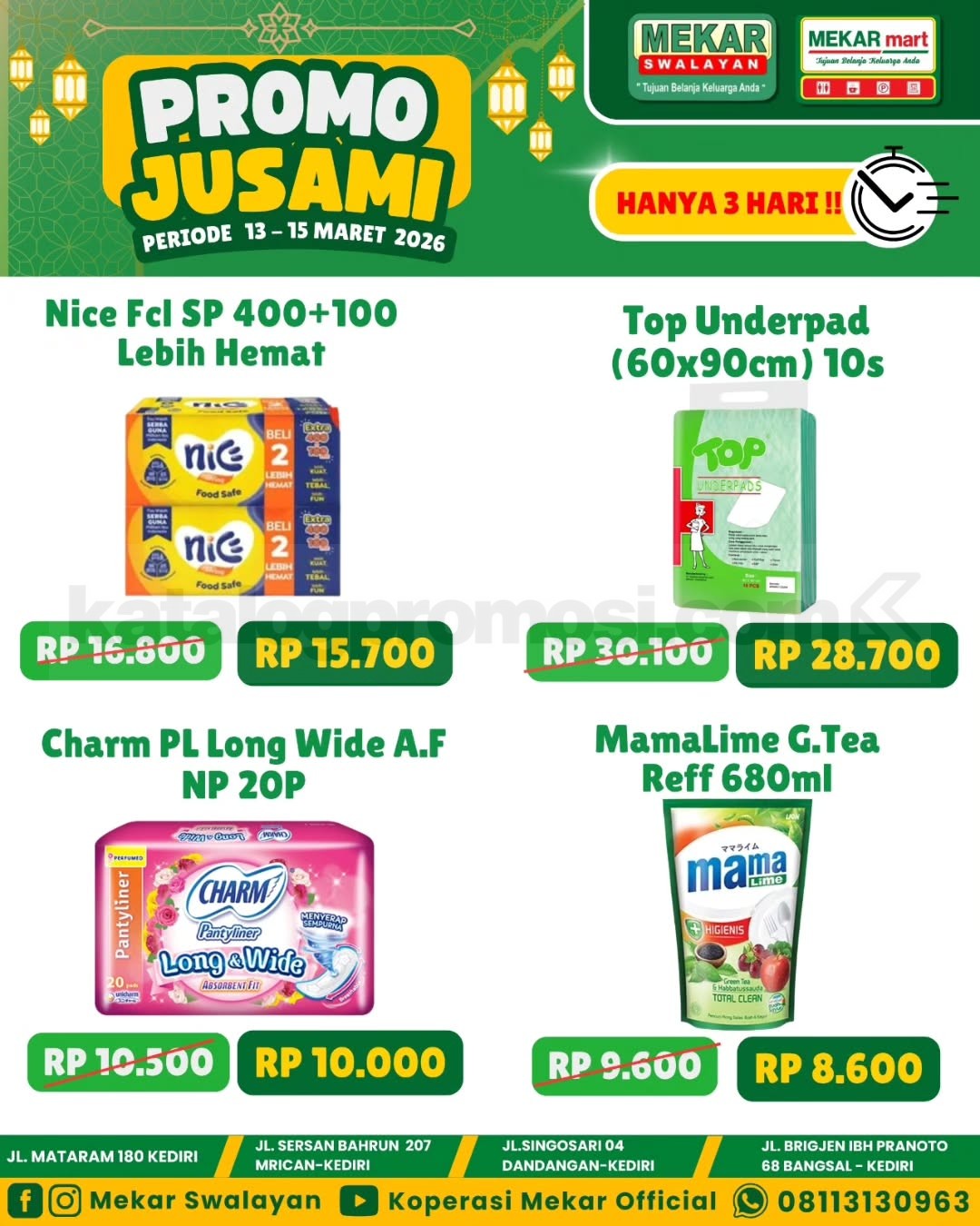 Promo Mekar Swalayan JUSAMI Kediri cuma 13-15 Maret 2026! Belanja hemat di Mekar Mart & Corner Point dengan banyak penawaran menarik tiap hari.