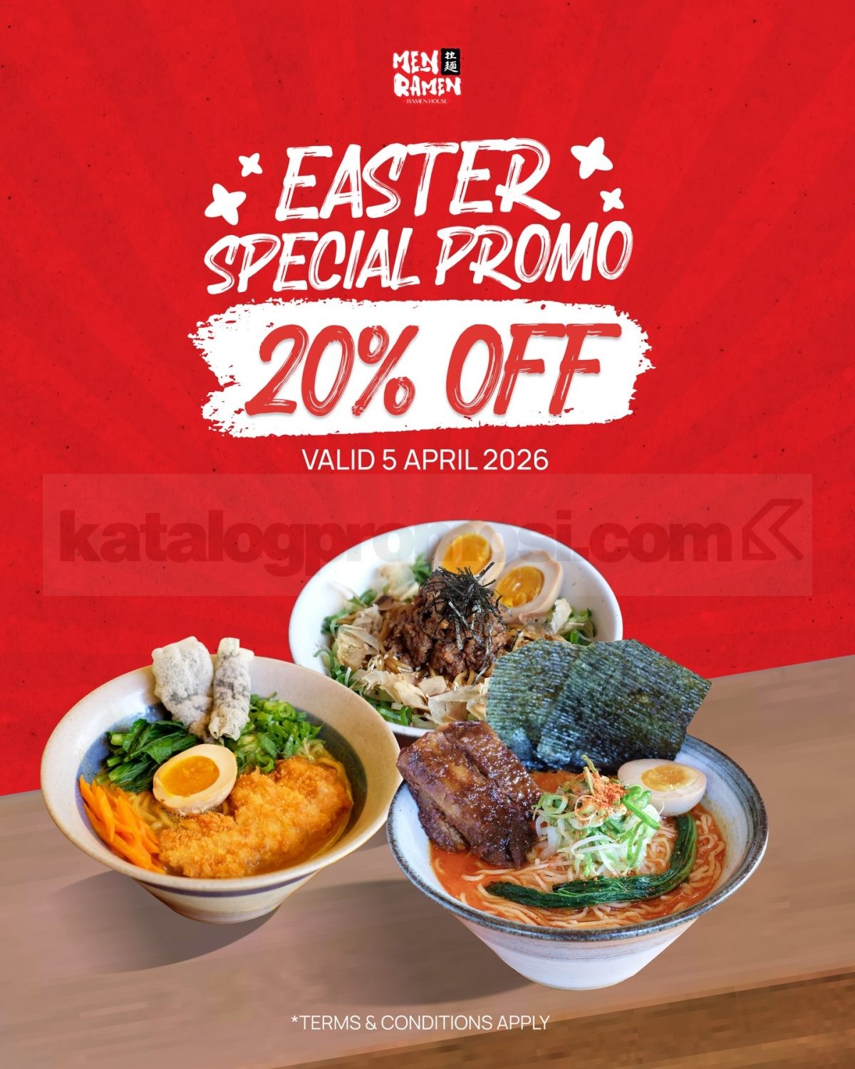 Promo Men Ramen Easter Special Diskon 20% hanya 1 hari, tanggal 5 April 2026 untuk pembelian dine-in di outlet Men Ramen dengan potongan 20% untuk semua menu.