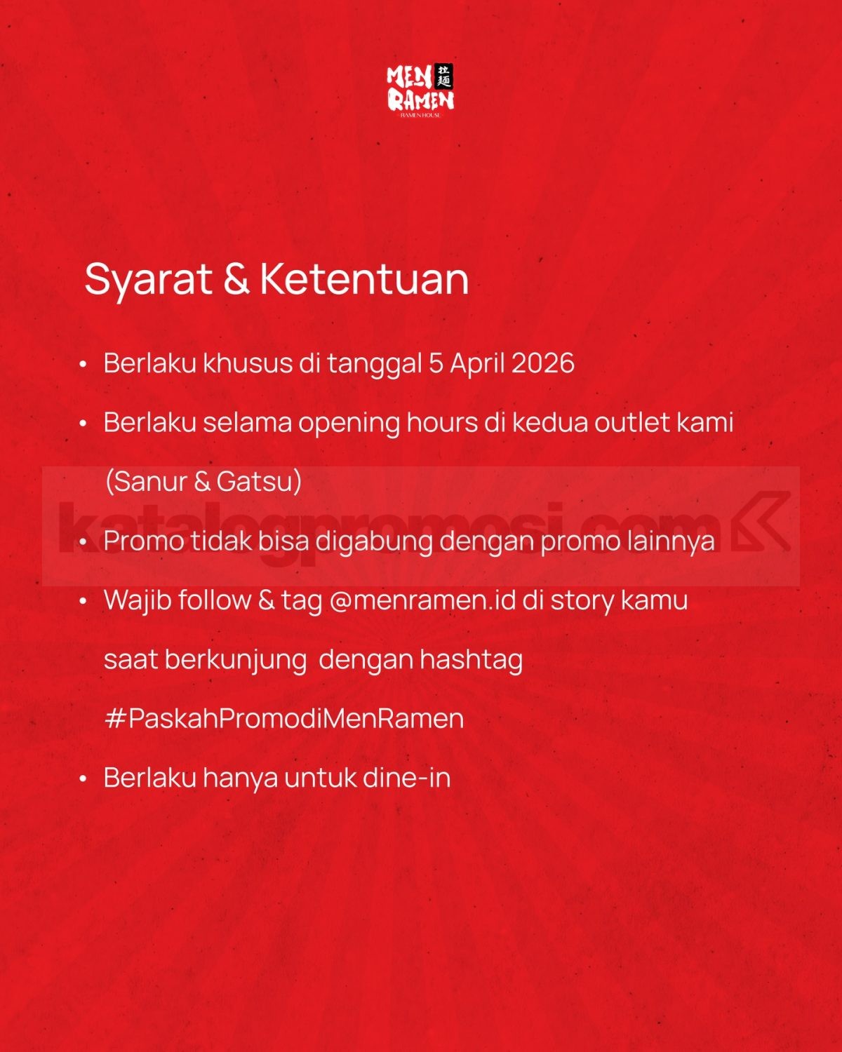 - Wajib follow dan tag @menramen.id di story dengan hashtag #PaskahPromodiMenRamen saat berkunjung.