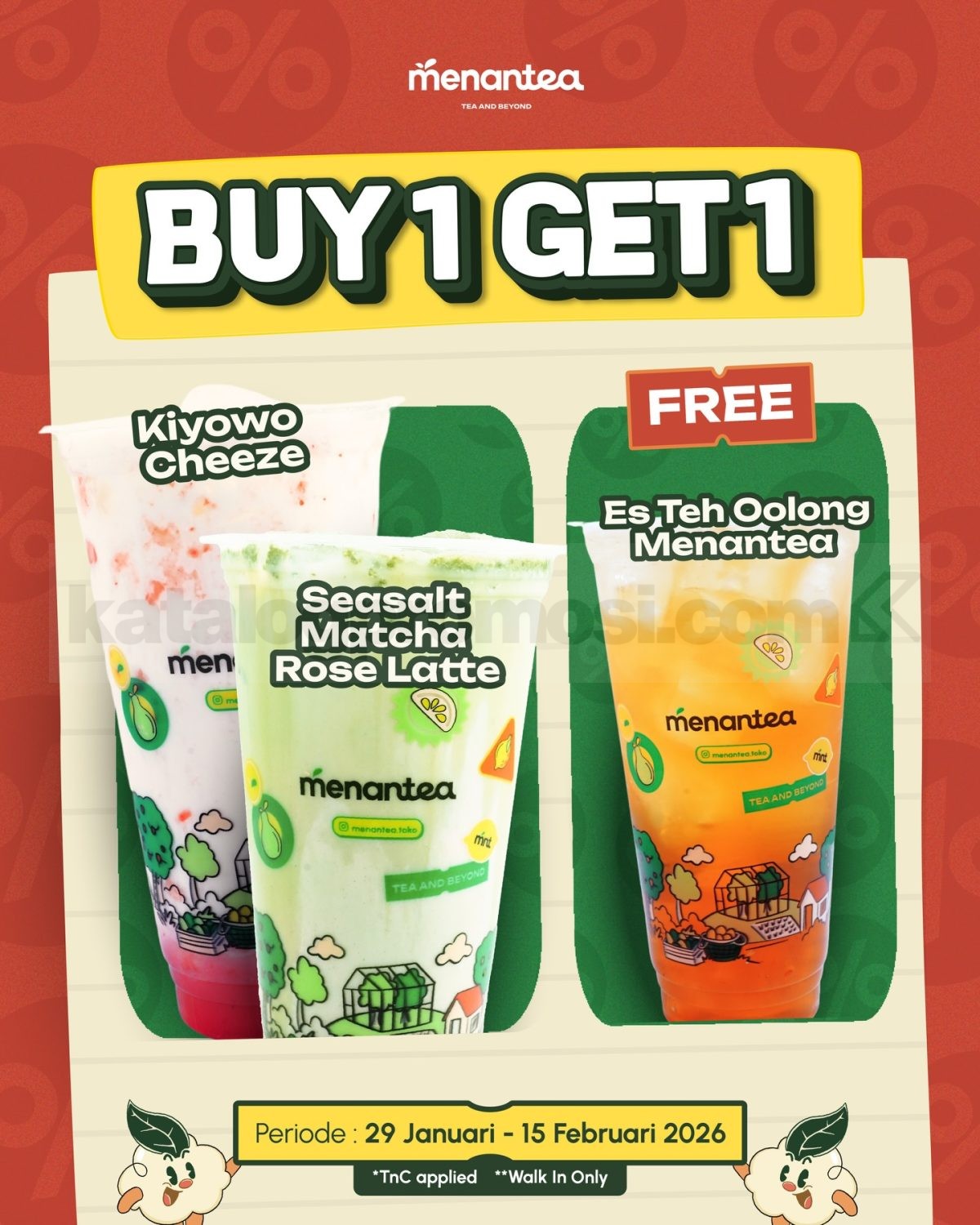 Promo Menantea Buy 1 Get 1 minuman favorit gratis dengan pembelian Kiyowo Cheeze atau Seasalt Matcha Rose Latte, walk-in berlaku mulai tanggal 29 Januari 2026 – 15 Februari 2026 di seluruh outlet.