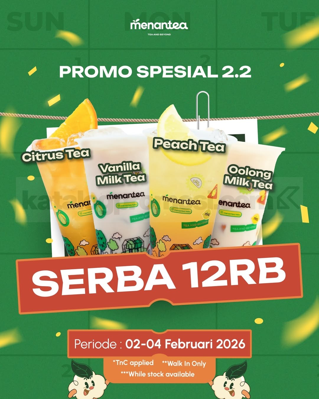 Promo Menantea Spesial 2.2 minuman favorit serba Rp. 12.000 dengan pilihan varian teh populer, walk in langsung berlaku mulai tanggal 2 Februari 2026 – 4 Februari 2026 di seluruh outlet