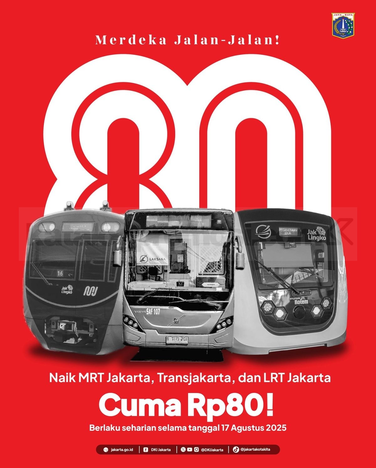 Rayakan HUT ke-80 Republik Indonesia dengan cara hemat dan seru! Selama dua hari, 17 dan 18 Agustus 2025, tarif semua layanan Transjakarta, MRT Jakarta, dan LRT Jakarta cuma Rp80. Promo spesial ini berlaku mulai pukul 00.00 hingga 23.59 setiap harinya.