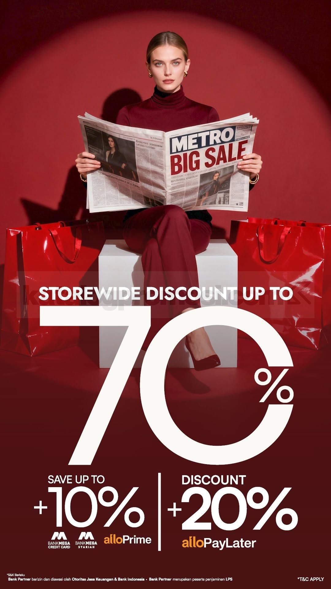 Promo METRO BIG SALE Diskon Hingga 70% berlaku mulai 10 April – 10 May 2026 di seluruh gerai dengan tambahan keuntungan bagi pengguna kartu kredit Bank Mega dan Allo Bank.