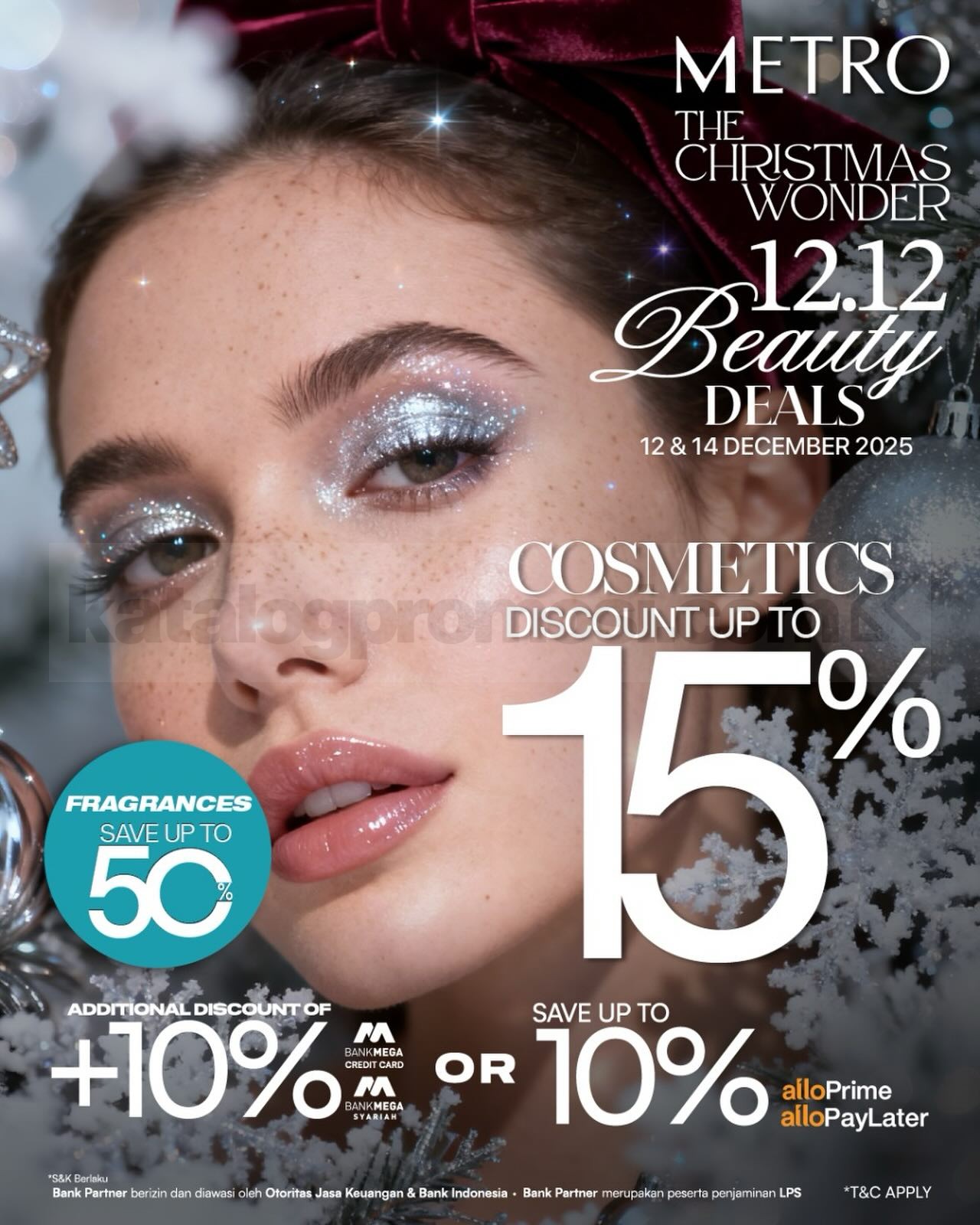 Promo Metro Christmas Wonder 12.12 Beauty Deals diskon hingga 50% berlaku 12 dan 14 Desember 2025 dengan tambahan potongan dari Bank Mega, alloPrime, dan alloPayLater.