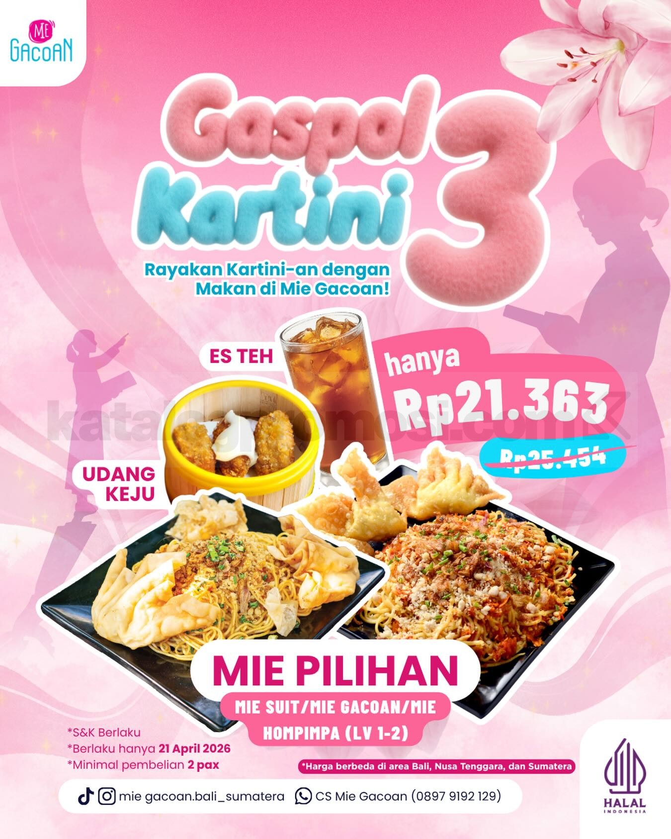 Semua dalam satu paket seharga Rp. 21.363 per pax untuk Promo Mie Gacoan Hari Kartini GASPOL 3 Kartini Rp. 21.363 tanggal 21 April 2026, minimal pembelian 2 pax dan harga dapat berbeda di area Bali, Nusa Tenggara, dan Sumatera.