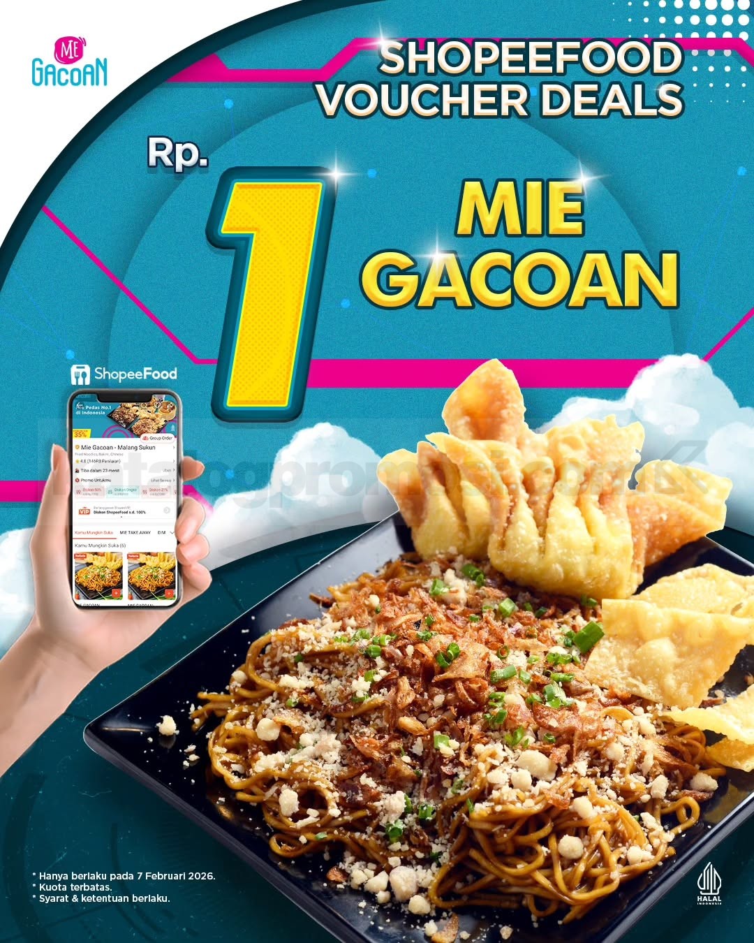 Promo Mie Gacoan ShopeeFood Deals Rp. 1 berlaku hanya di tanggal 7 Februari 2026 mulai 11.00 WIB, pesan lewat aplikasi ShopeeFood di lokasi tertentu selama kuota masih ada.