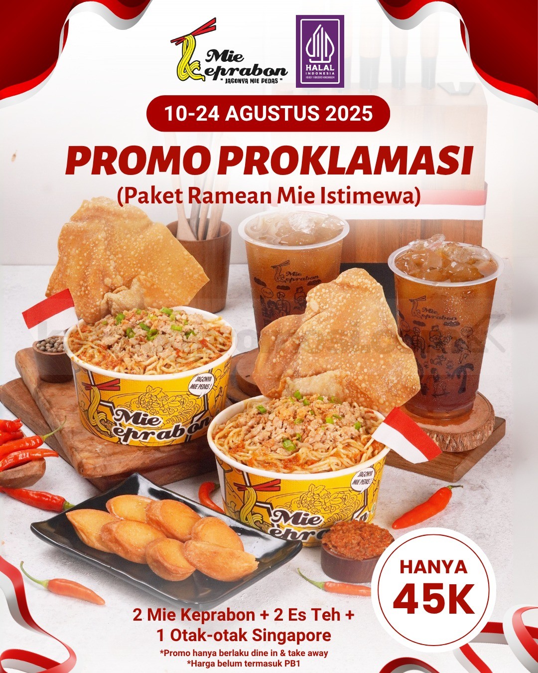 Rayakan kemerdekaan bareng menu hemat yang bikin perut kenyang tanpa bikin kantong tipis. Paket Ramean Mie Istimewa dari Mie Keprabon ini berisi 2 porsi Mie Keprabon, 2 gelas es teh manis, dan 1 porsi otak-otak Singapore, semuanya hanya Rp45.000.