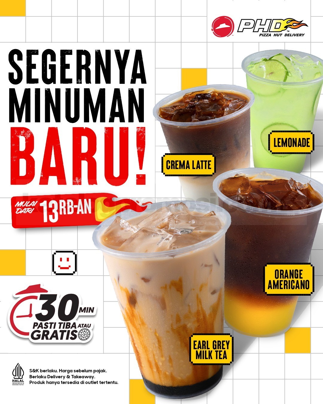 Cobain Promo PHD Minuman Baru sekarang juga dan rasakan kesegaran 4 varian barunya plus bonus Butter Cookie gratis yang bikin hari kamu makin happy! Pesan sekarang lewat aplikasi Pizza Hut atau food merchant pilihanmu biar gak kehabisan 💛✨