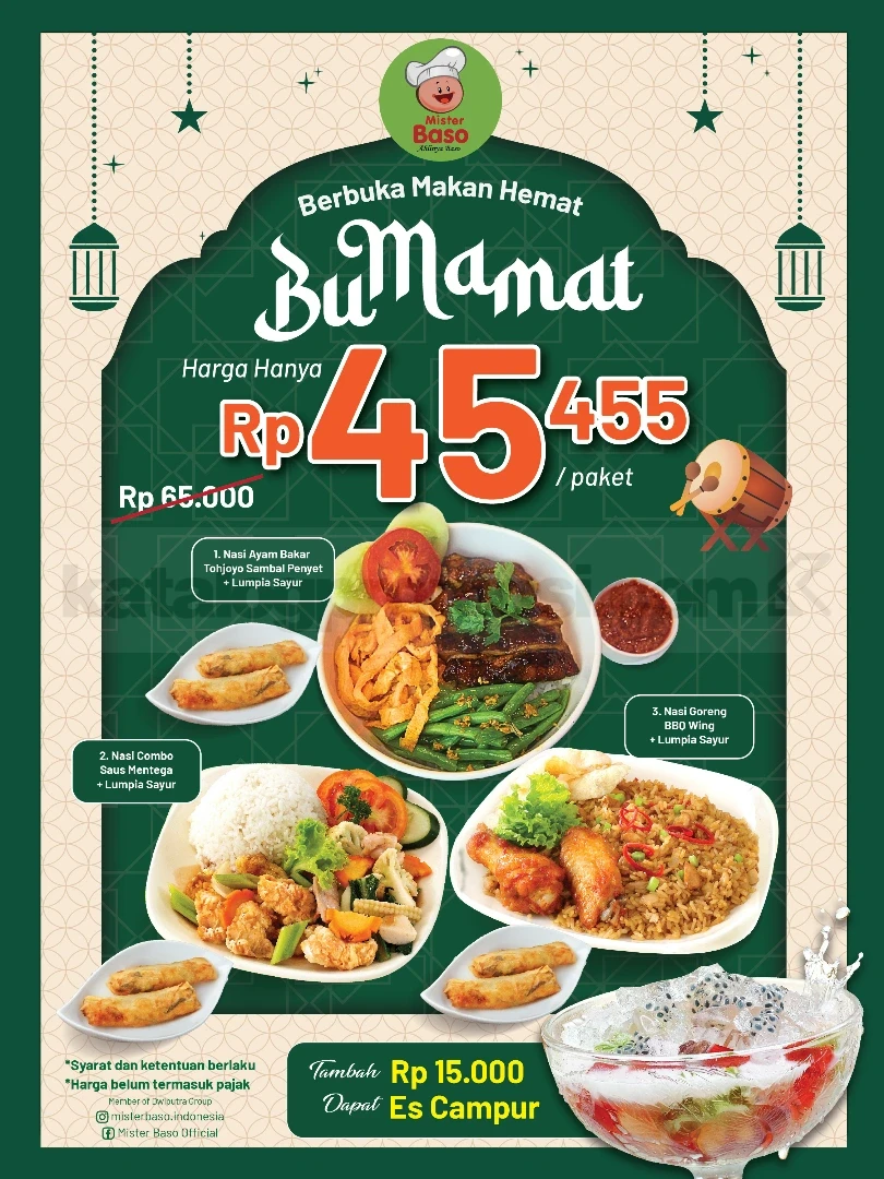 Setelah lihat flyernya, makin yakin kan kalau buka puasa hemat tetap bisa enak dan lengkap? Jangan lewatkan kesempatan nikmati paket Bu Mamat ini bareng orang-orang terdekat di Mister Baso favoritmu.