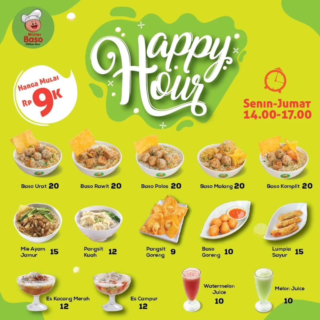 Sekarang nikmati dua menu lezat sekaligus plus Teh Pucuk mulai Rp. 59.900! ππ΅ Promo Mister Baso Special Buy 1 Get 1 bikin makan jadi lebih hemat dan puas tanpa harus bayar dua kali.