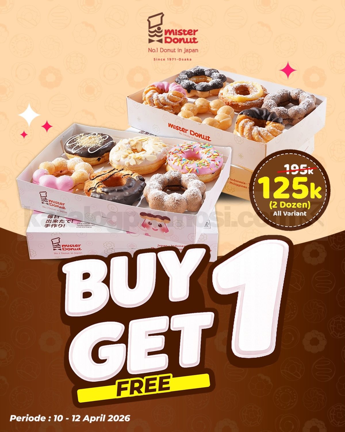 Promo Mister Donut Beli 1 Gratis 1 Lusin Donat dengan harga Rp. 125.000 dapat 24 donat favorit berlaku 10 April 2026 – 12 April 2026 di seluruh outlet.