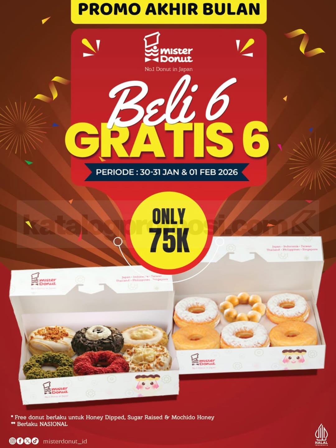 Promo Mister Donut Beli 6 Gratis 6 Donat , beli 6 donat gratis 6 donat cuma Rp. 75.000 berlaku untuk dine in dan take away, berlaku mulai tanggal 30 Januari 2026 – 1 Februari 2026 di seluruh outlet.