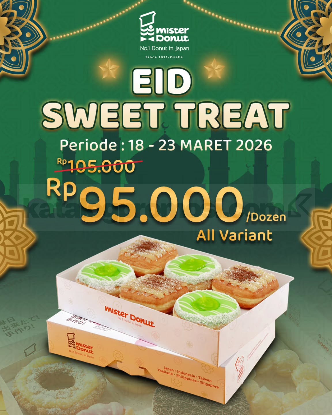 Promo Mister Donut Eid Sweet Treat Donat Rp. 95.000 per lusin untuk semua varian rasa berlaku 18 Maret 2026 – 23 Maret 2026 di outlet Mister Donut.