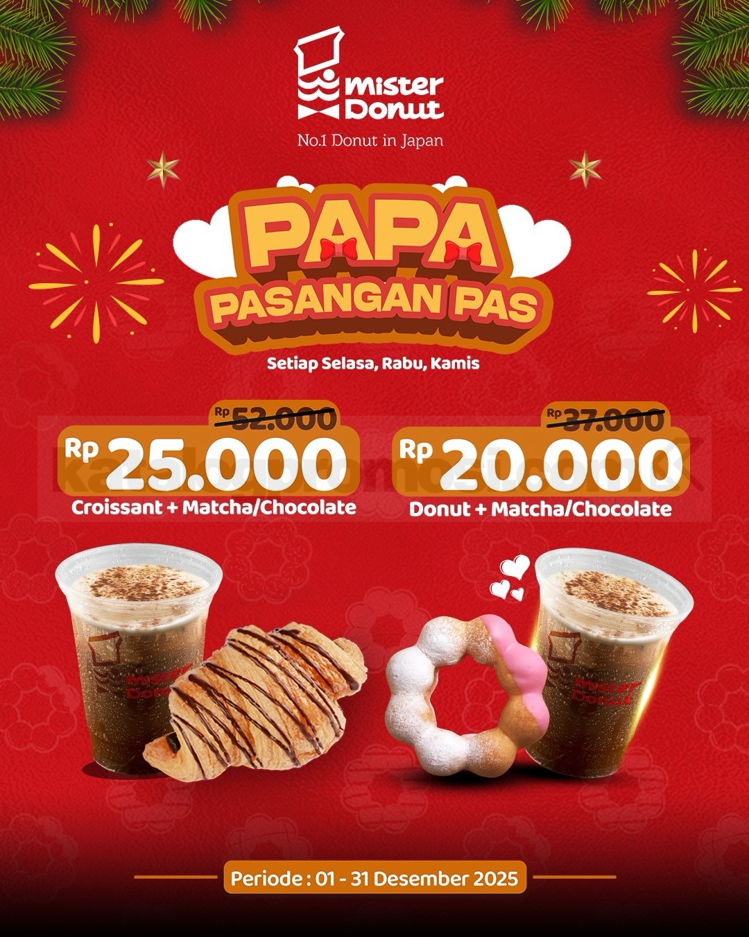 Promo Mister Donut Paket Pasangan Pas mulai Rp.20.000 dengan croissant atau donut plus minuman matcha atau chocolate, berlaku mulai 1 Desember 2025 – 31 Desember 2025.