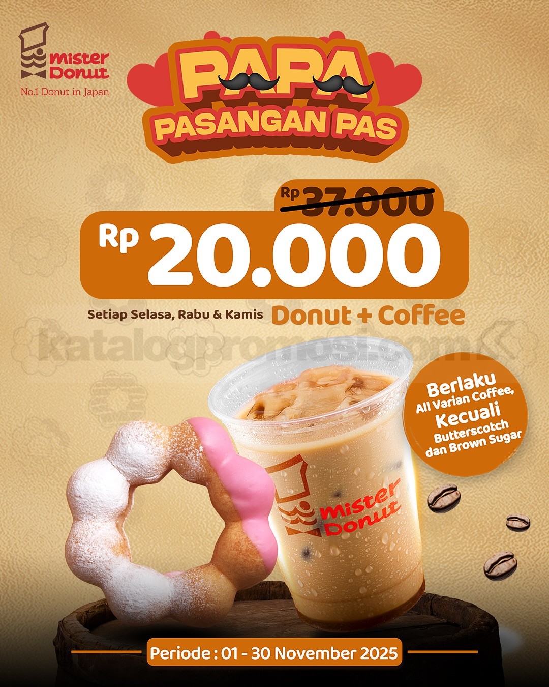 Promo Mister Donut Pasangan Pas Donut + Coffee Rp.20.000 buat kamu pecinta kopi dan donut, berlaku setiap Selasa, Rabu, dan Kamis di seluruh outlet Mister Donut.