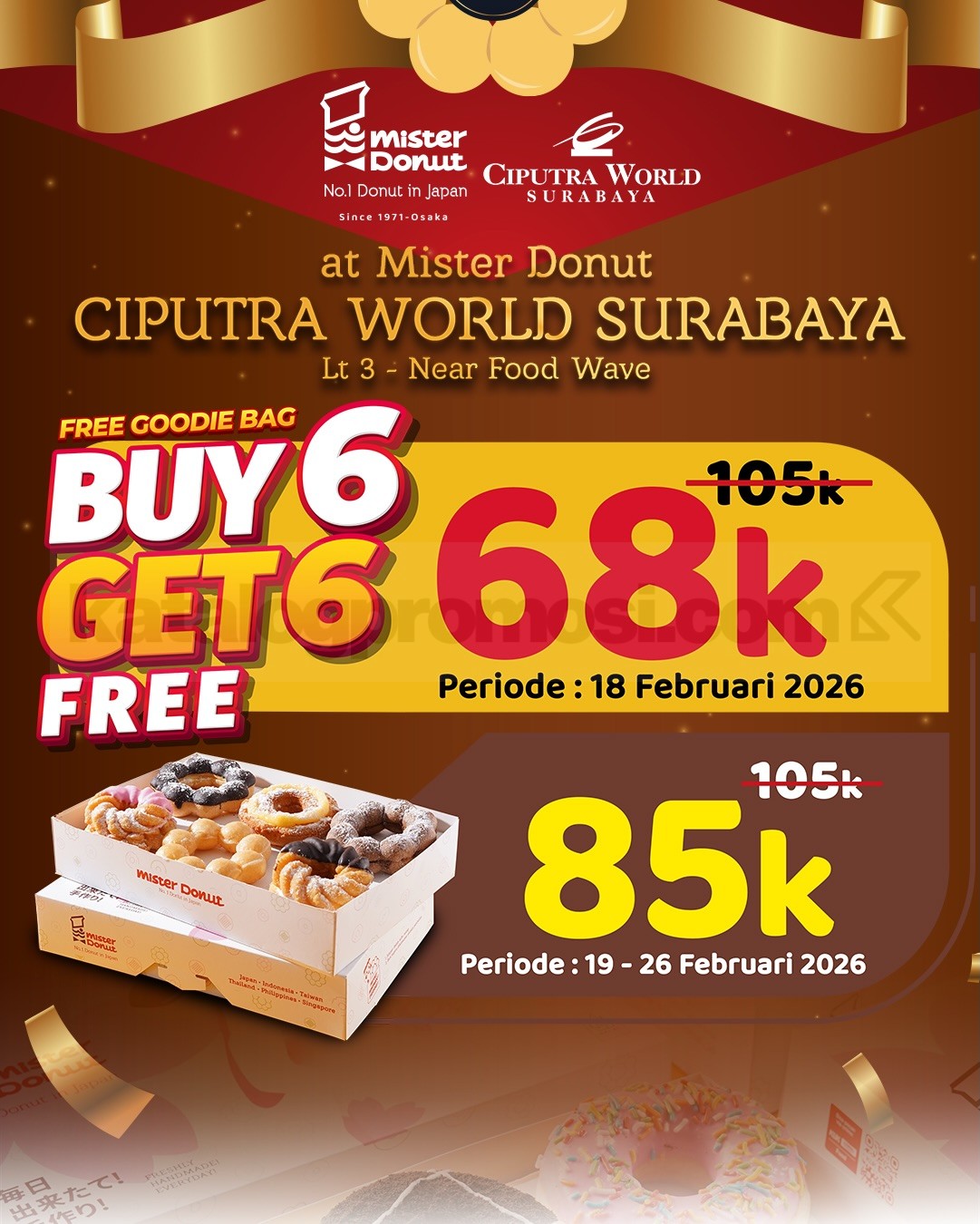 Promo Mister Donut Re-Opening Ciputra World Surabaya berlaku 18 Februari 2026 dengan Beli 6 Gratis 6 Rp. 68.000 dan 1000 donut gratis.