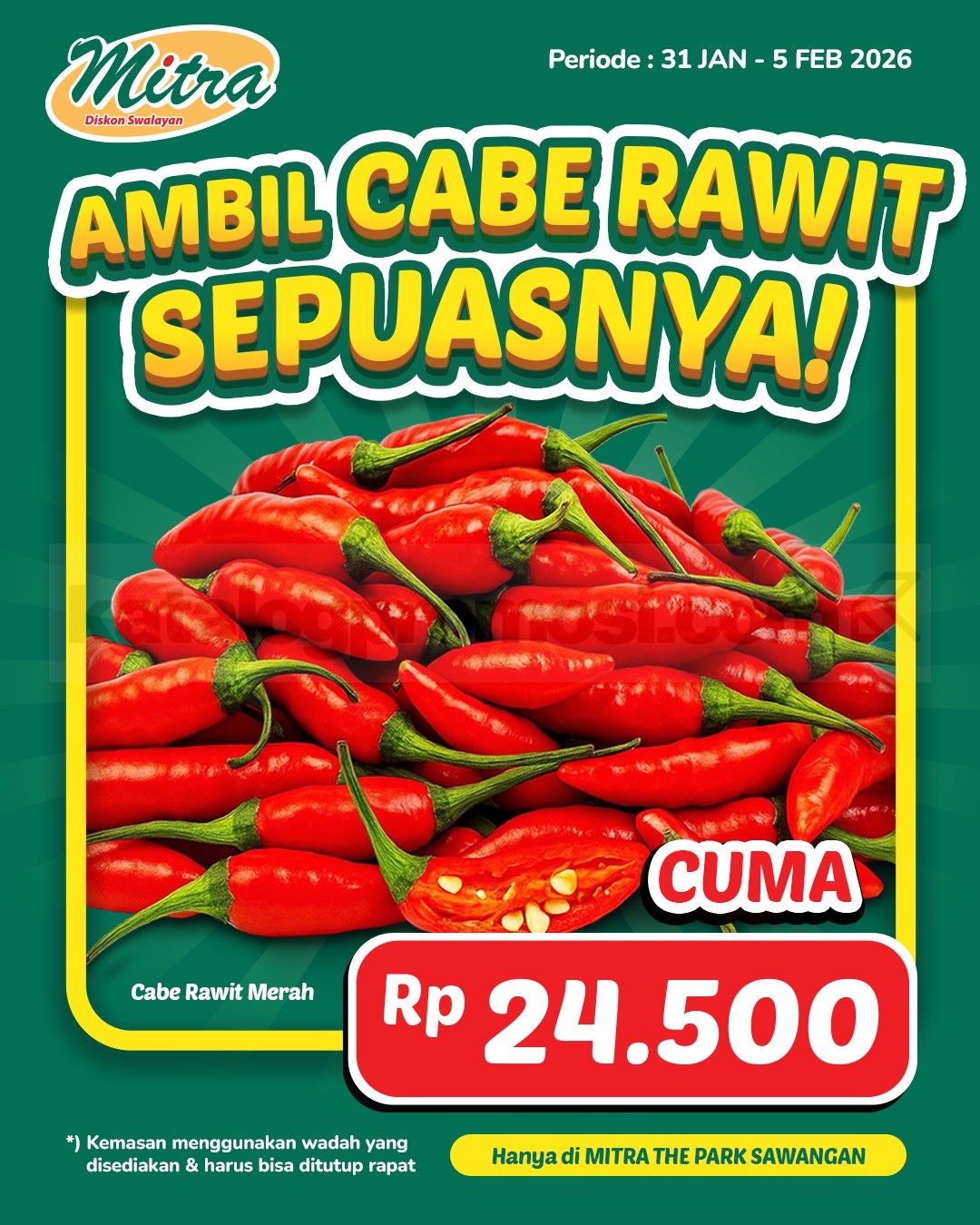 Promo MITRA Diskon Swalayan Ambil Cabe Rawit Sepuasnya Rp. 24.500 berlaku tanggal 31 Januari – 5 Februari 2026 khusus di MITRA The Park Sawangan.