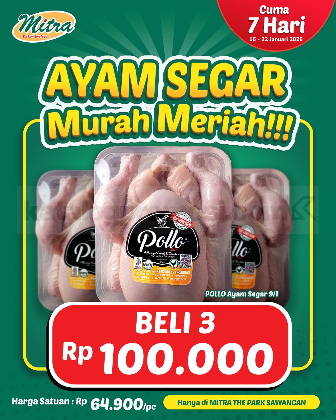 Promo MITRA DISKON SWALAYAN Ayam 1 Ekor Beli 3 Rp. 100.000 berlaku 16 – 22 Januari 2026 di Mitra The Park Sawangan lantai LG jam 10.00 – 22.00 WIB.