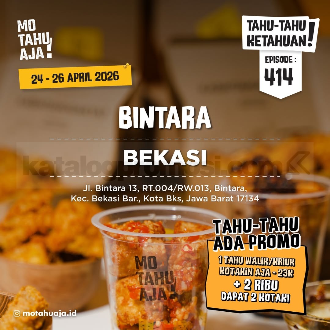Promo Mo Tahu Aja Bintara Bekasi 2 Box Tahu tambah Rp. 2.000 beli 1 gratis 1 hemat camilan berlaku mulai tanggal 24 April 2026 – 26 April 2026 di outlet Bintara