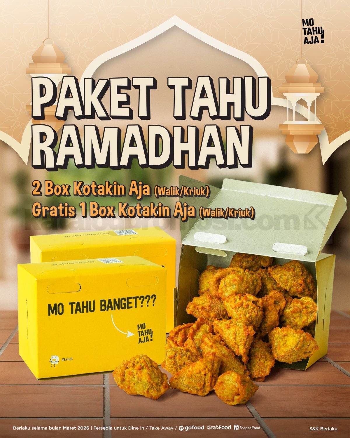Promo Mo Tahu Aja Paket Tahu Ramadhan Beli 2 Gratis 1 Kotakin Aja Walik atau Kriuk selama bulan Maret 2026 di seluruh outlet Mo Tahu Aja.