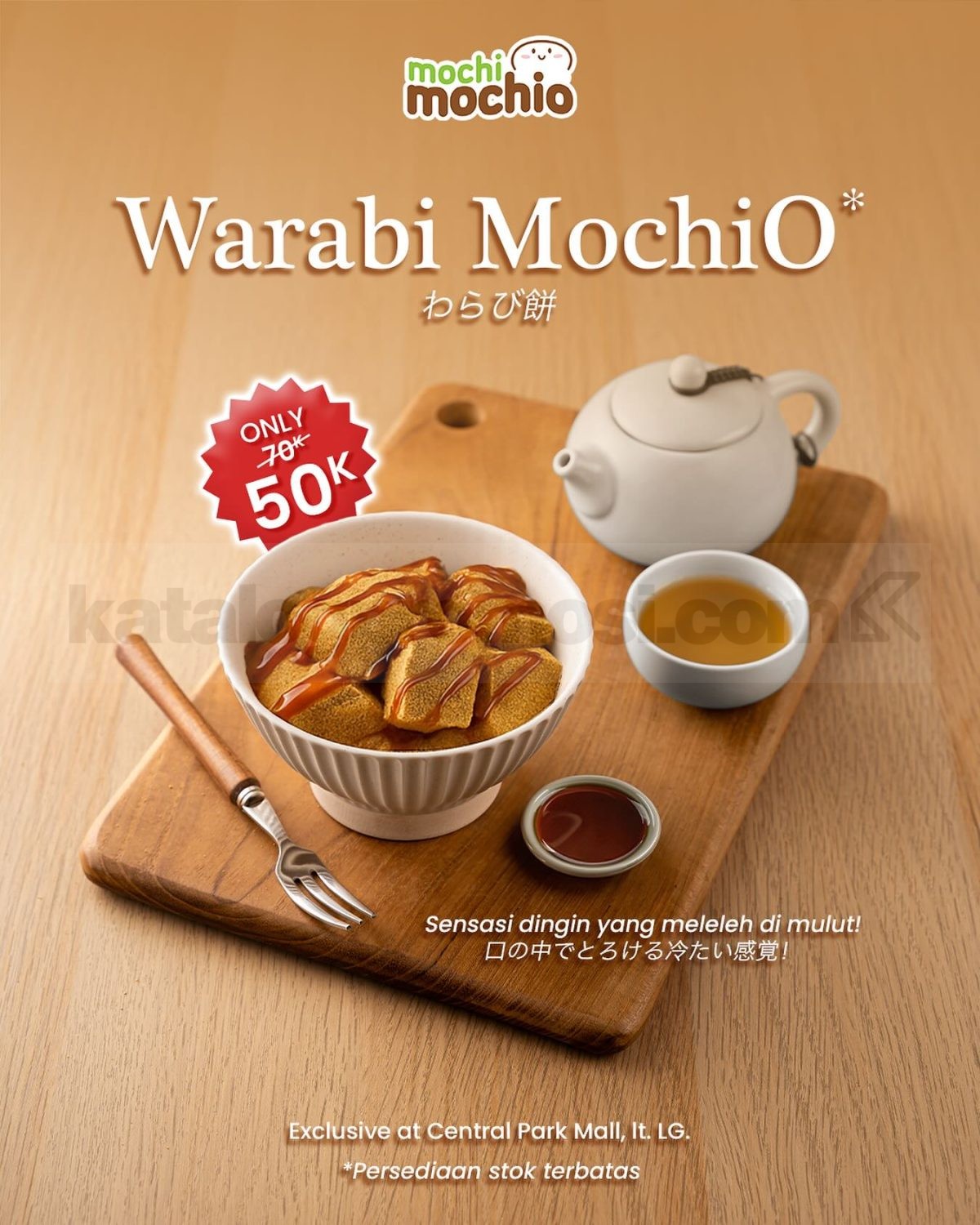 Promo Mochi Mochio harga spesial Warabi Mochi cuma 50K di Central Park Mall! Nikmati cemilan Jepang favorit ini sebelum kehabisan.