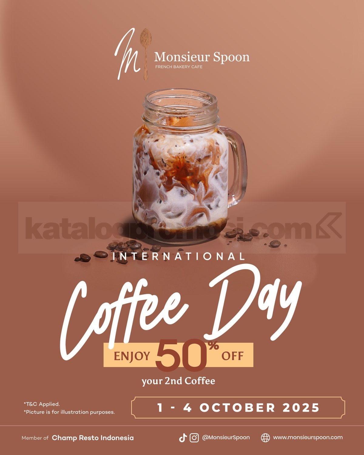 Promo Monsieur Spoon International Coffee Day Diskon 50% Khusus untuk pembelian kopi kedua, Berlaku mulai 1-4 Oktober 2025.