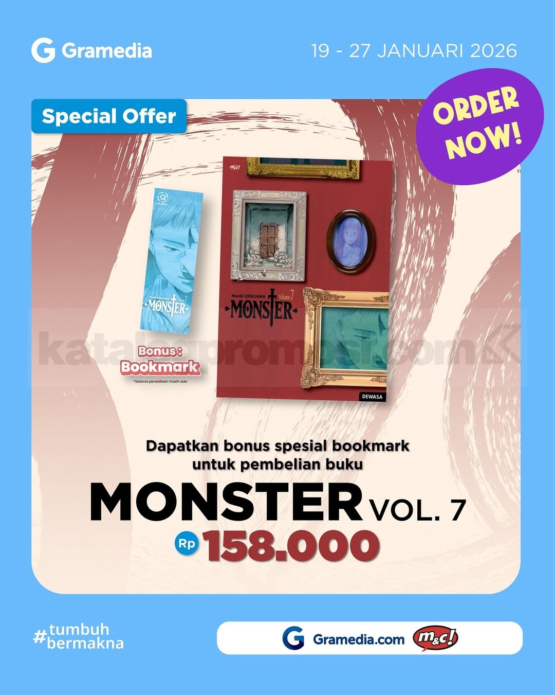 Promo Monster 07 buku seru Rp. 158.000 dengan bonus bookmark eksklusif, dapatkan ketegangan cerita Eva, Tenma, dan Roberto, berlaku 19-27 Januari 2026.