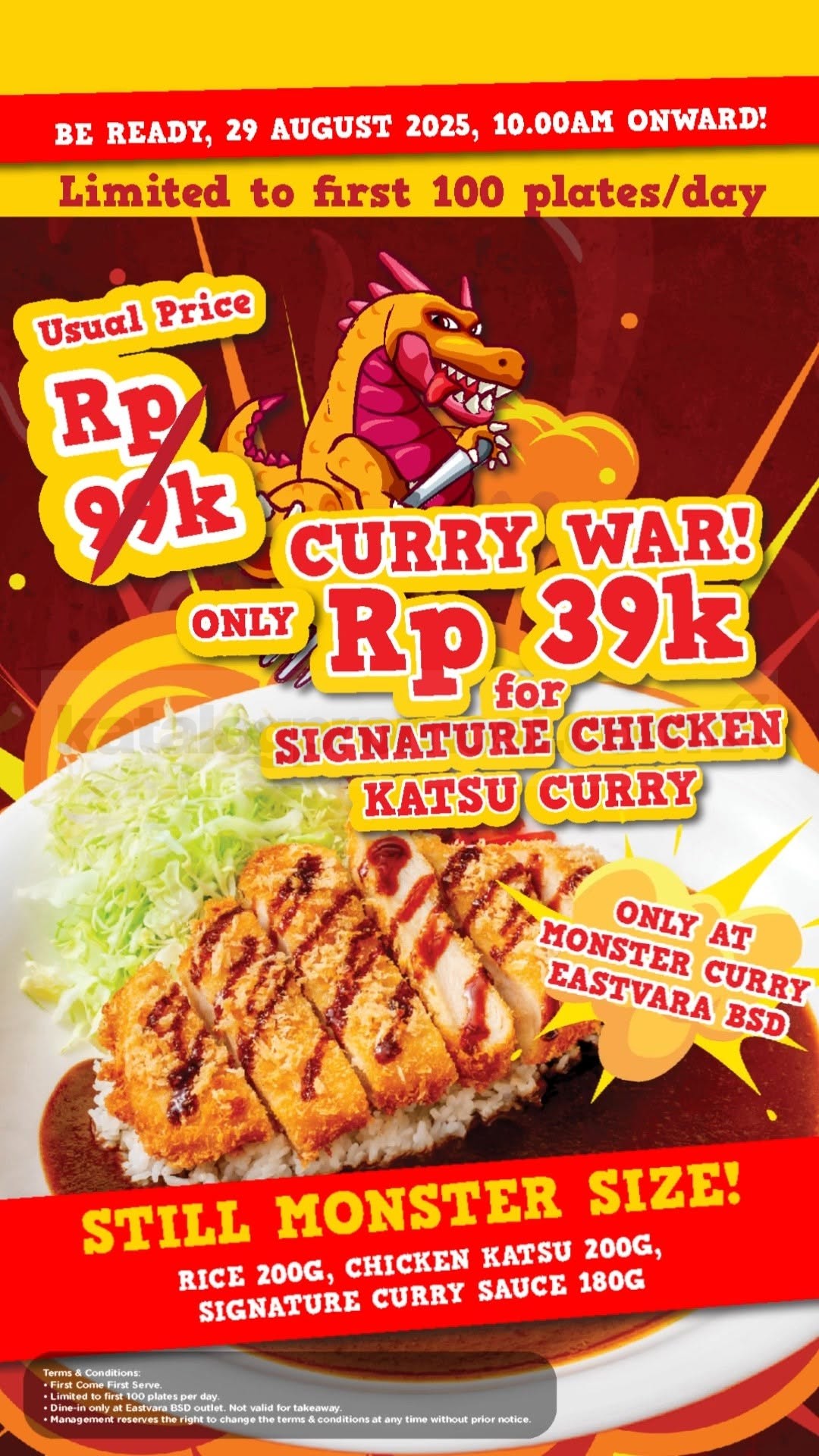 Promo Monster Curry Curry War Rp39.000 berlaku mulai 29 Agustus 2025 di Eastvara BSD, nikmati Signature Chicken Katsu Curry spesial untuk 100 porsi per hari dine-in.