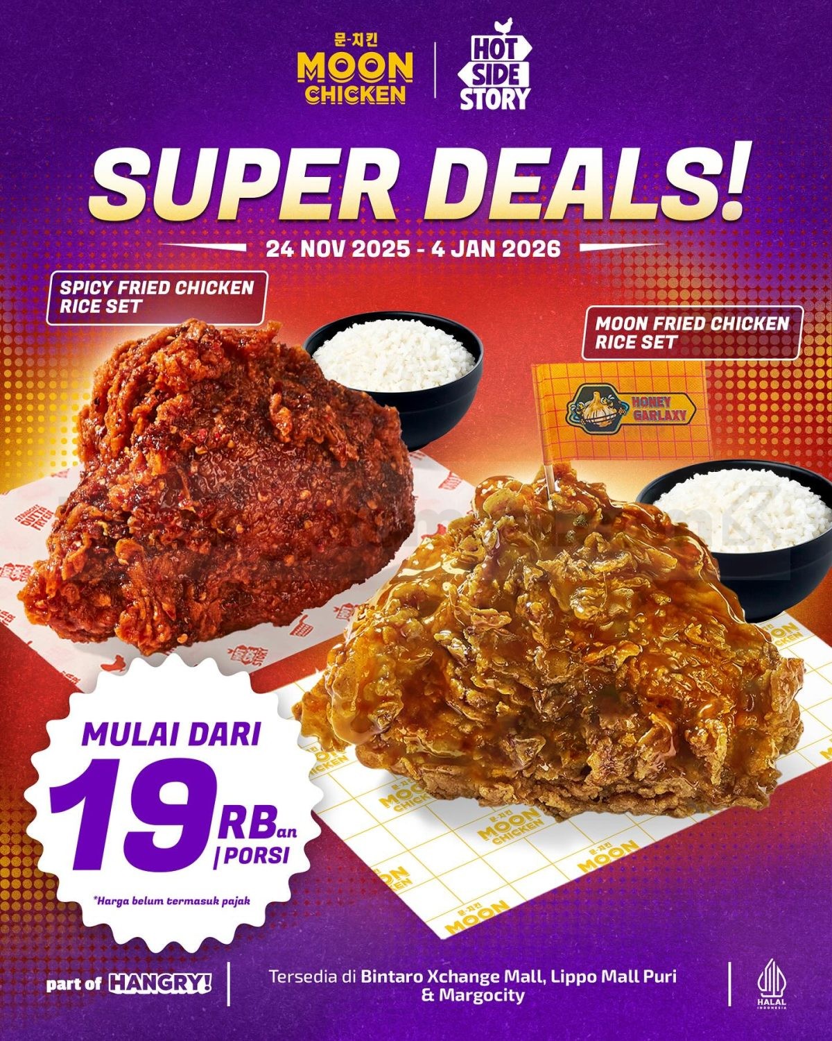 Promo Moon Chicken x Hot Side Story Super Deals! Mulai Rp. 19.000, nikmati manis Korean atau pedas fiery, berlaku 24 November 2025 β 4 Januari 2026 di beberapa outlet.