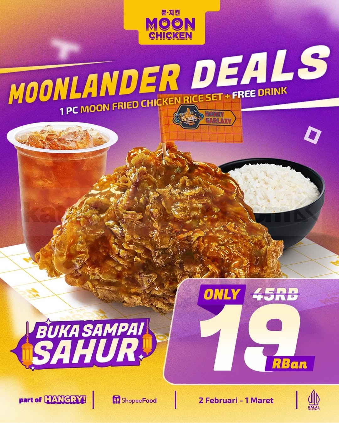 Promo Moon Chicken Moonlander Deals Rp. 19.000 paket ayam + minum via ShopeeFood berlaku mulai tanggal 2 Februari 2026 – 1 Maret 2026