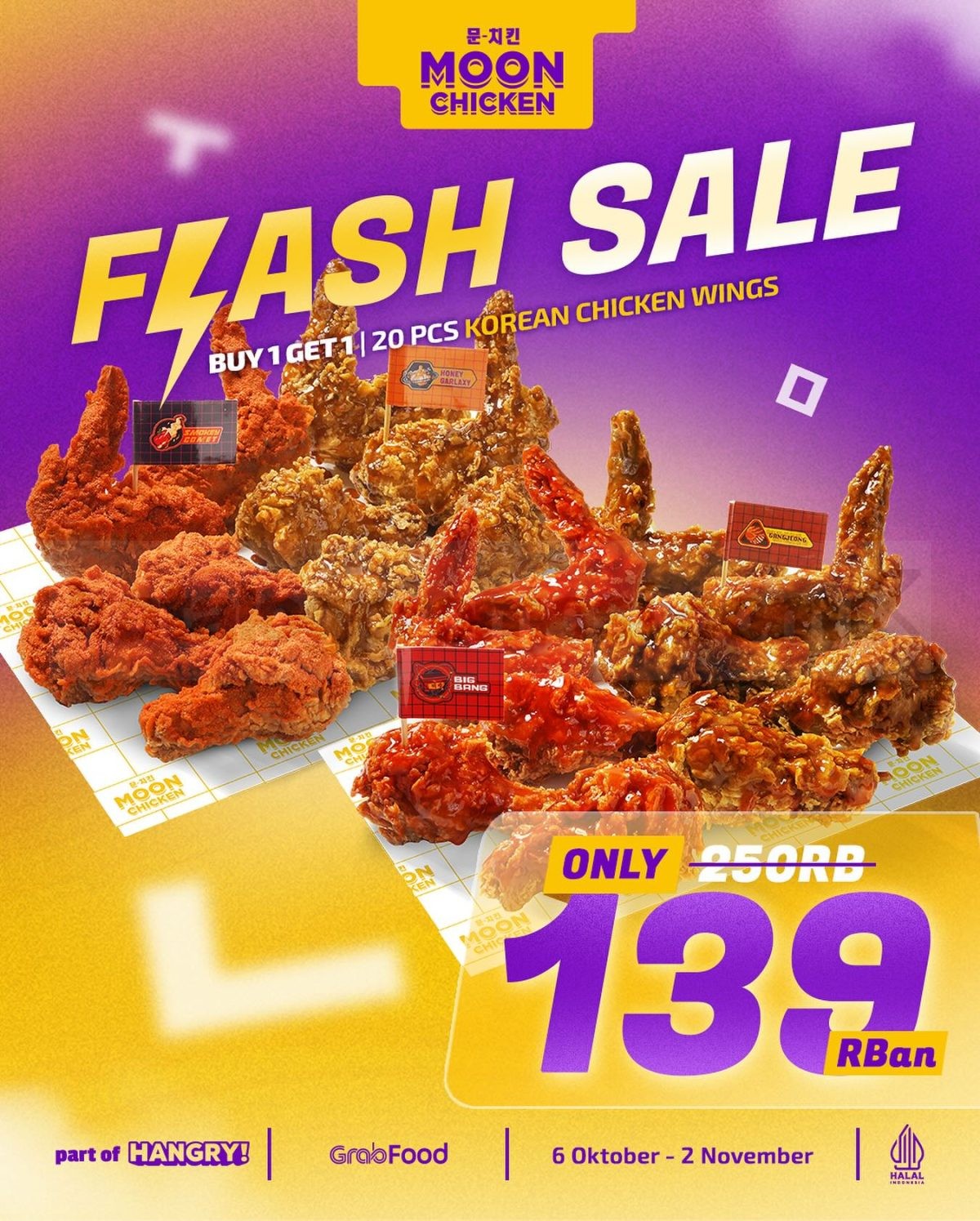 Promo Moon Chicken Spesial GrabFood Flash Sale Buy 1 Get 1, Berlaku mulai 6 Oktober-2 November 2025.