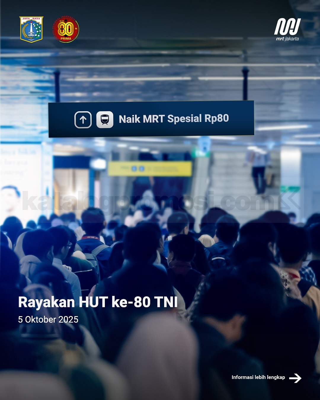 Promo MRT Jakarta HUT TNI Ke-80 Tarif Spesial Rp80 untuk perjalanan seharian penuh, berlaku mulai tanggal 5 Oktober 2025 di seluruh stasiun MRT Jakarta.