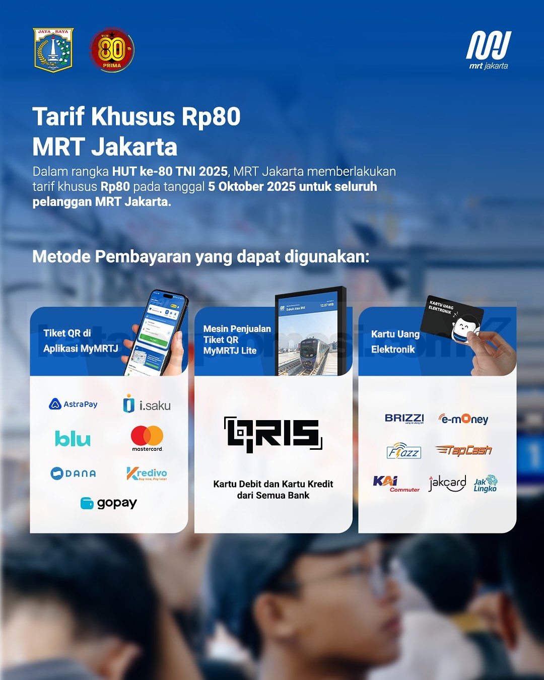 Nikmati tarif spesial Rp80 di seluruh lintasan MRT Jakarta untuk memperingati HUT ke-80 TNI. Pembayaran bisa dilakukan menggunakan kartu uang elektronik atau aplikasi pembayaran digital yang terintegrasi.
