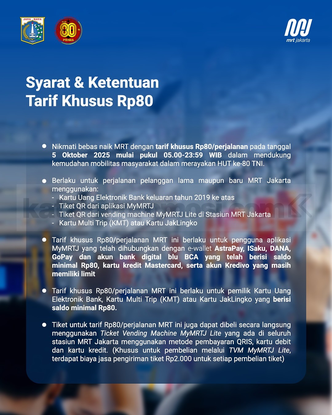 Dalam rangka memperingati HUT ke-80 TNI, MRT Jakarta menghadirkan kembali Tarif Spesial Rp80 yang bisa kamu nikmati pada Minggu, 5 Oktober 2025 pukul 00.00 – 23.59 WIB.