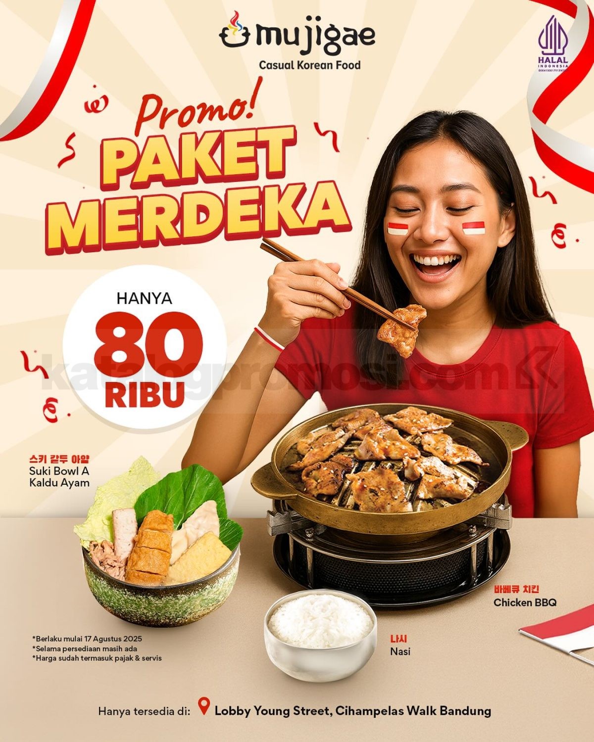 Promo Mujigae Merdeka Paket Rp80.000 isi Suki Bowl, Chicken BBQ, dan Nasi berlaku mulai tanggal 17 Agustus 2025 di Mujigae Cihampelas Walk Bandung.