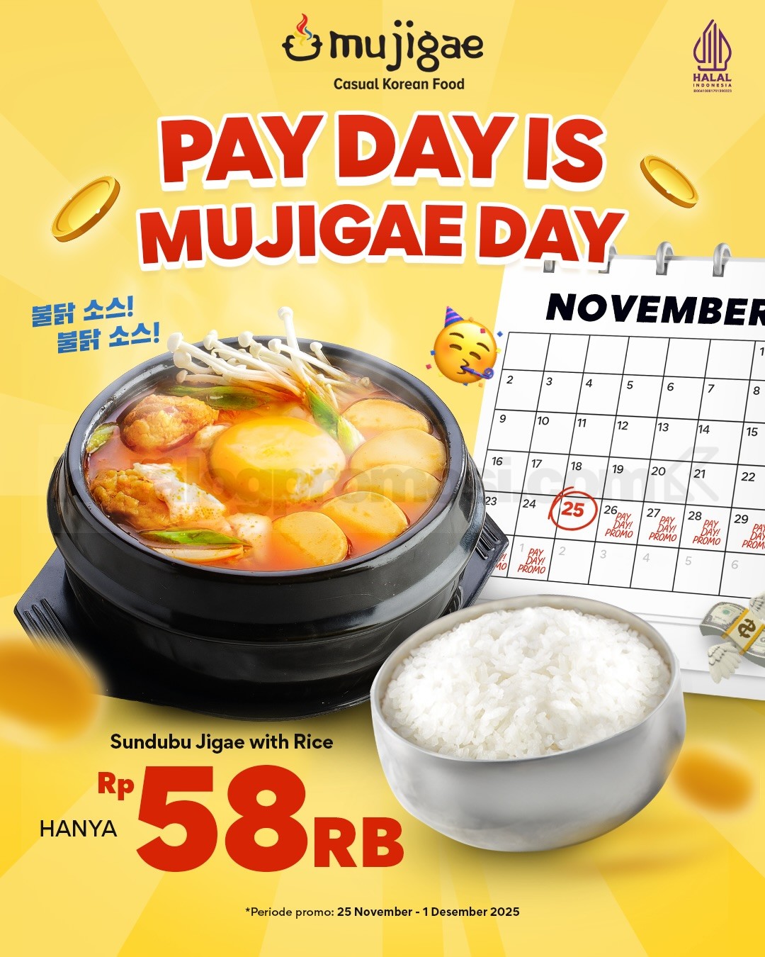 Promo Mujigae Pay Day Sundubu Jigae + Rice Hanya Rp58.000 berlaku 25 November β 1 Desember 2025
