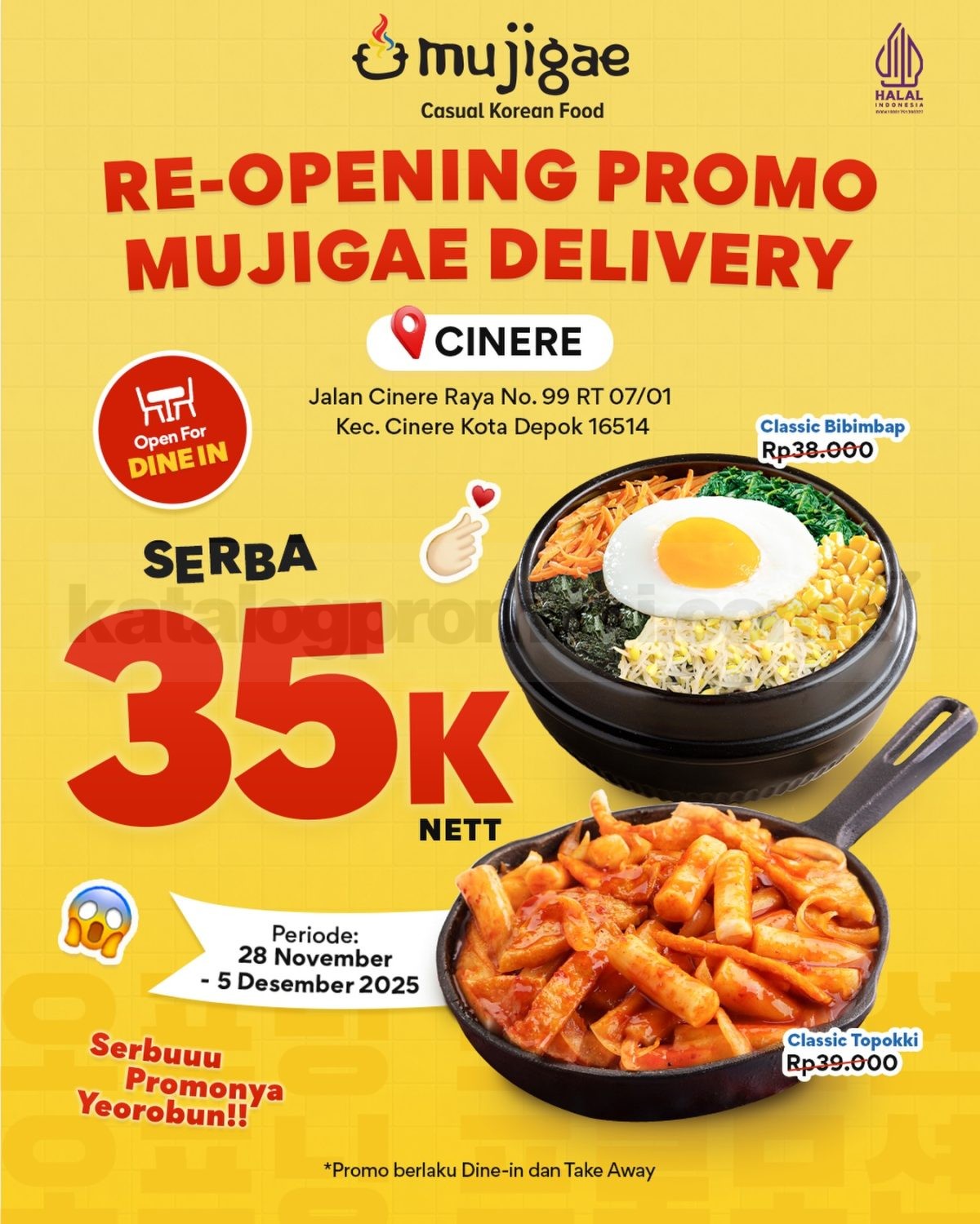 Promo Mujigae Re-Opening Cinere Delivery Rp. 35.000 untuk Bibimbap dan Topokki, berlaku dine-in & take away 28 November โ 5 Desember 2025 di Mujigae Cinere.