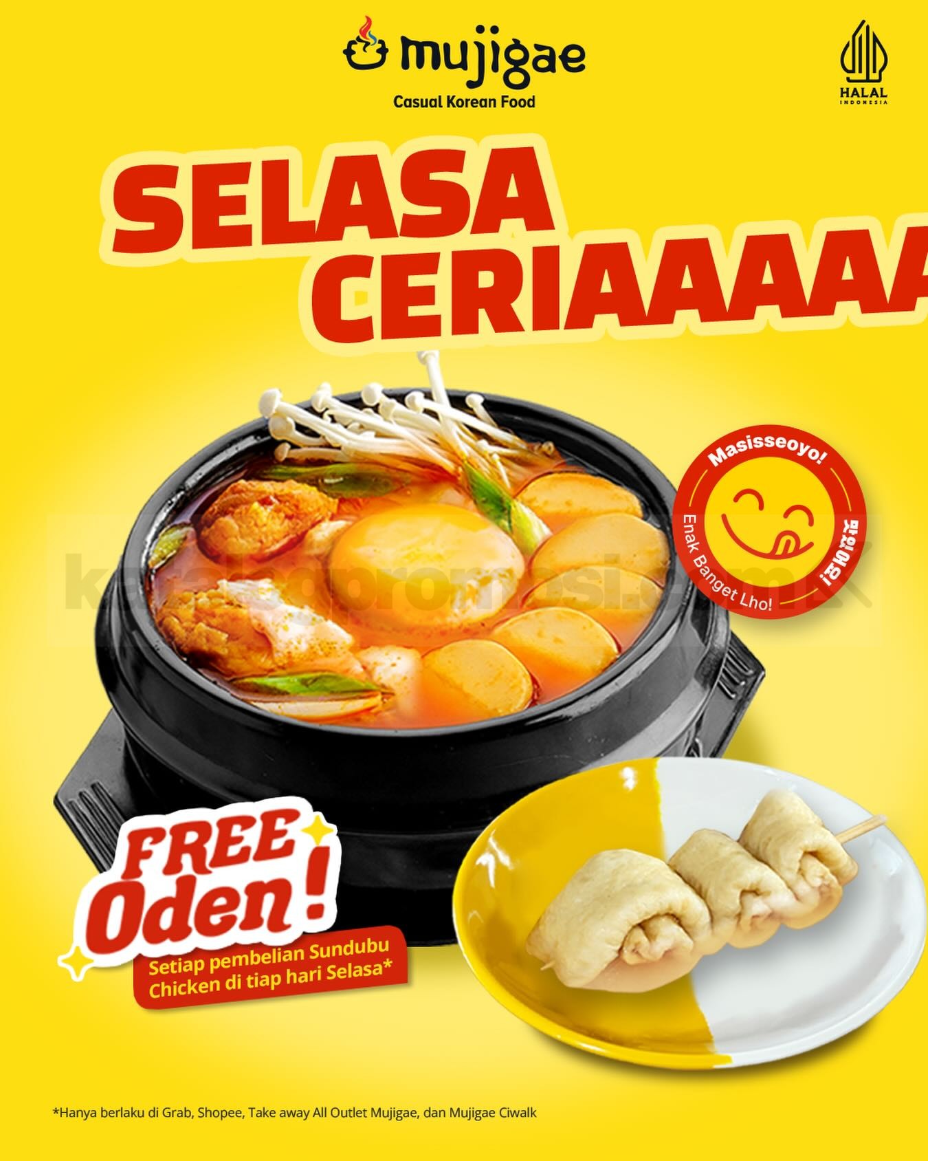 Promo berlaku untuk GrabFood, ShopeeFood, Take Away, dan outlet Mujigae Cihampelas Walk Bandung.