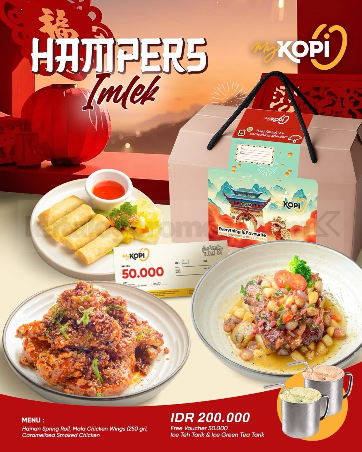 Promo My Kopi O Hampers Imlek Rp. 200.000 + Free Voucher ini berisi Hainan Spring Roll yang renyah, Mala Chicken Wings seberat 250 gram dengan sensasi pedas menggoda, Caramelized Smoked Chicken dengan cita rasa khas, serta Ice Teh Tarik dan Ice Green Tea Tarik yang menyegarkan. Tak hanya itu, setiap pembelian juga langsung mendapatkan Free Voucher Rp50.000 yang bisa dimanfaatkan di kesempatan berikutnya.