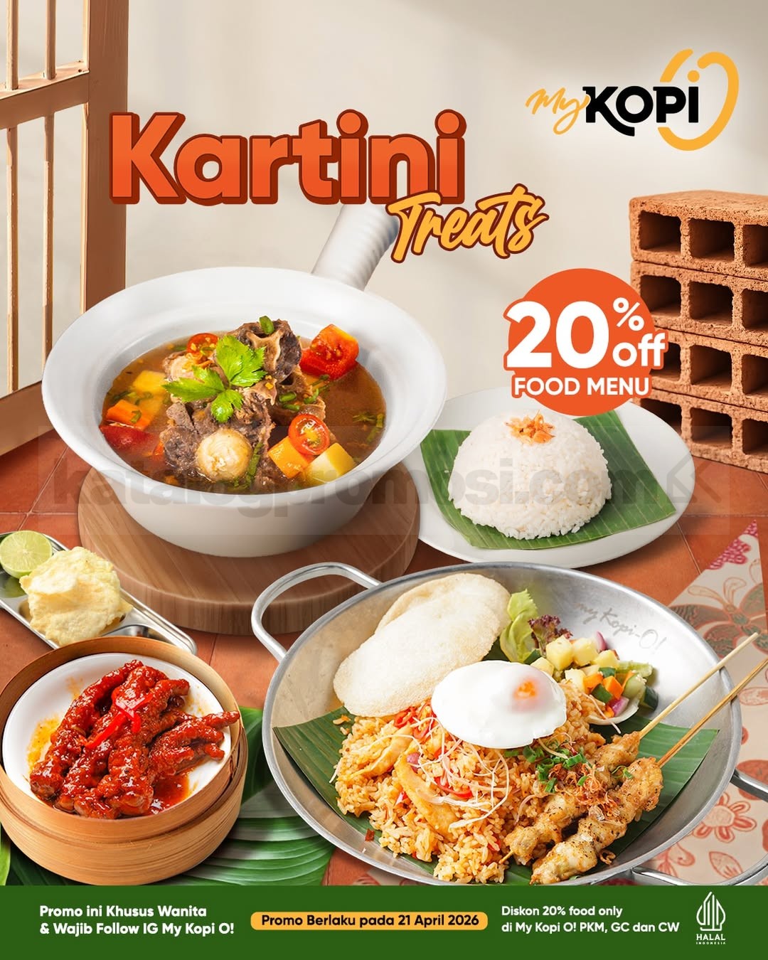 Dalam rangka peringatan Kartini pada 21 April 2026, My Kopi-O memberikan penawaran spesial berupa diskon 20% untuk menu makanan pilihan. Promo ini ditujukan khusus untuk pelanggan wanita yang ingin menikmati momen santai dengan suasana hangat di My Kopi-O.