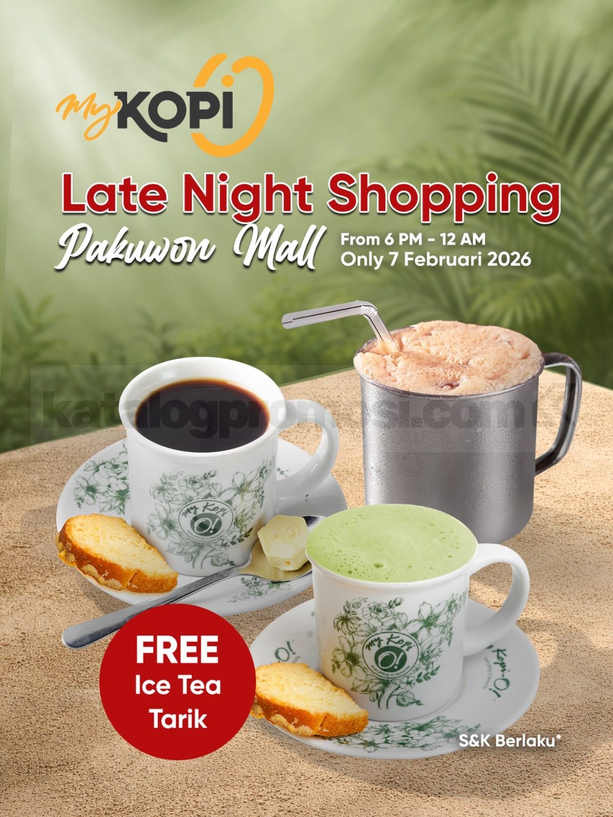 Promo My Kopi O Late Night Shopping Free Ice Tea Tarik dengan pembelian menu tertentu, menemani belanja malam berlaku 7 Februari 2026 di Pakuwon Mall.